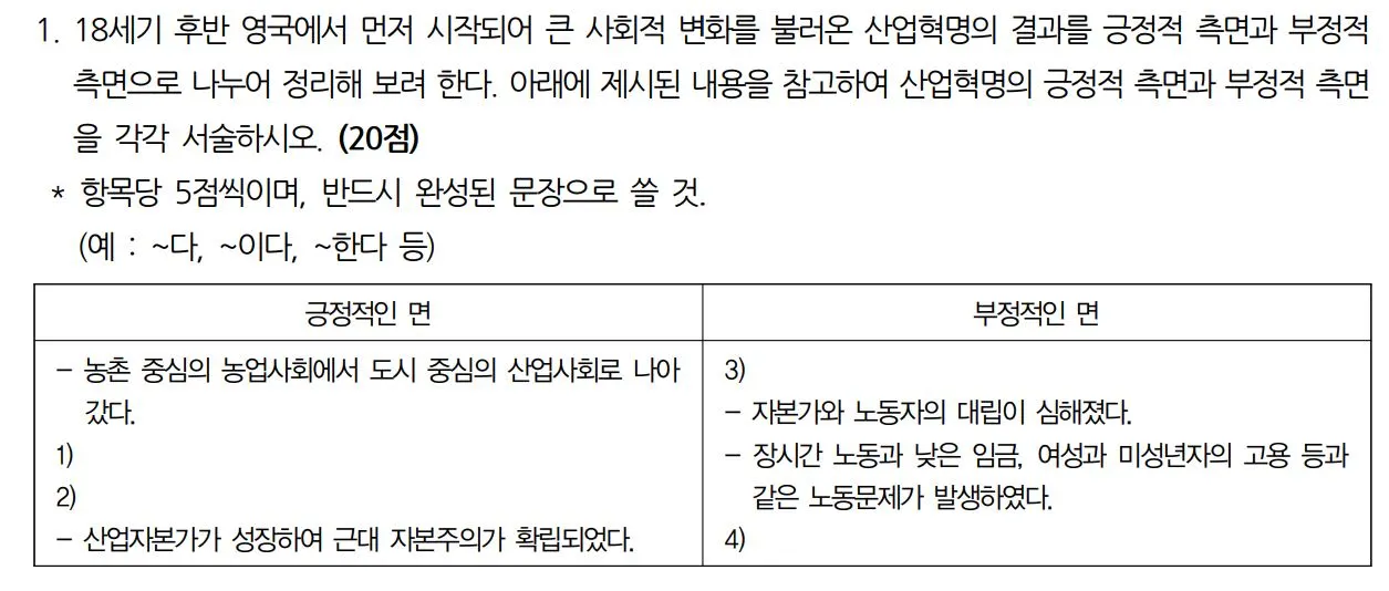 이 문제는 수업 중에 이미 다룬 것이며, 활동지의 요점 정리를 약간 변형한 것이어서 비교적 난이도가 낮은 문제였으나, 사고력을 키우기보다는 이미 아는 사실을 정확하게 써내기를 요구하는 결과를 초래하였다. 산업혁명은 일반사회나 도덕, 기술 과목 등에서도 배우기 때문에 매우 상식적인 답을 쓰게 되는 문제이기도 하다. 외양은 서술형이지만, 결과적으로 암기를 요하는 문제였고, 객관식 선다형으로 고르게 하는 것보다 과연 더 좋은 문제라고 할 수 있을까 하는 지적을 받았다.