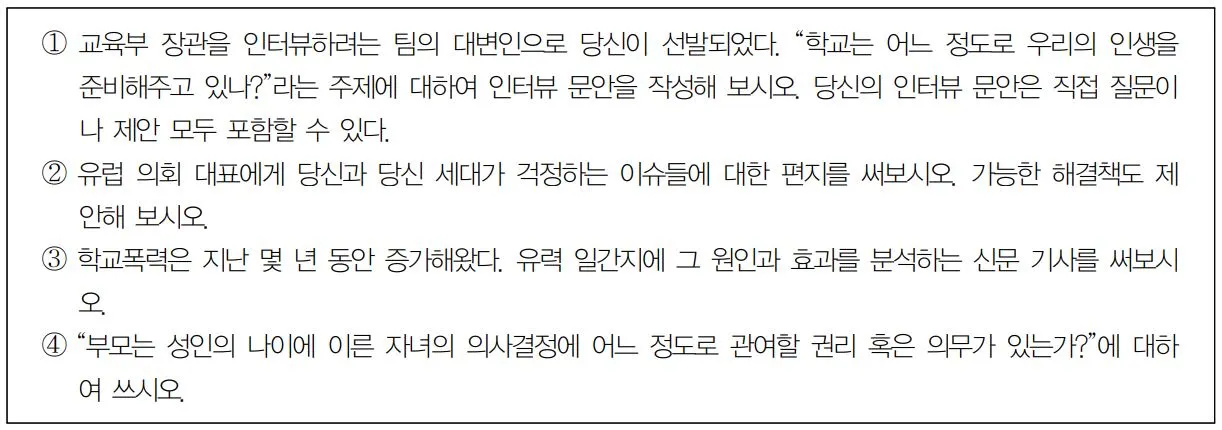 위의 문제들은 대체로 학생이 인터뷰어나 신문기자가 된다거나 청소년 입장에서 유럽 의회에 건의하는 글, 부모의 개입에 대한 생각 등을 쓰게 하여 매우 현실감 있는 질문으로 구성되어 있다. 다소 추상적인 내용을 학습했더라도 학생 자신의 삶과 밀접하게 연관시켜 질문함으로써 단지 점수를 받기 위해 답을 쓰는 것이 아니라 자신의 일상을 성찰하고 변화시킬 수 있는 계기를 제공해준다는 점에서도 시사하는 바가 크다.