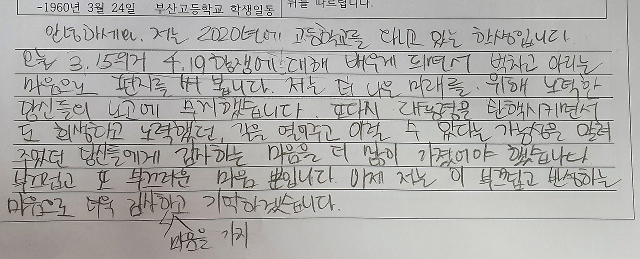 역사적 인물에게 편지를 쓰는 활동은 조금 식상하지만 비교적 쉽게 감성적인 접근을 할 수 있는 활동이다. 자료로 부산고등학교 학생들의 호소문 일부와 수송초등학교 학생이 쓴 시를 제시하였고, 그 학생들의 시위 모습에 대해 간단히 설명을 하고 편지쓰기를 하였다. 자신들과 같은 고등학생 뿐 아니라 초등학생들까지 시위에 참여하고 희생당하기도 했다는 사실에 분위기가 무거워졌지만 그들을 생각하며 진지한 분위기 속에서 활동이 진행되었다.