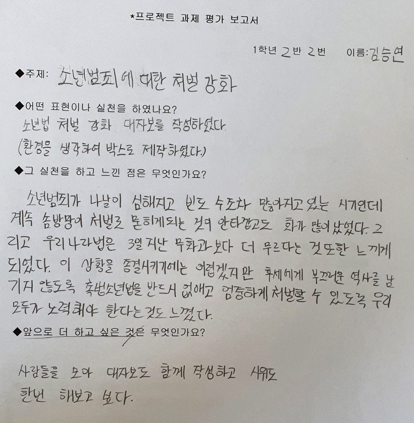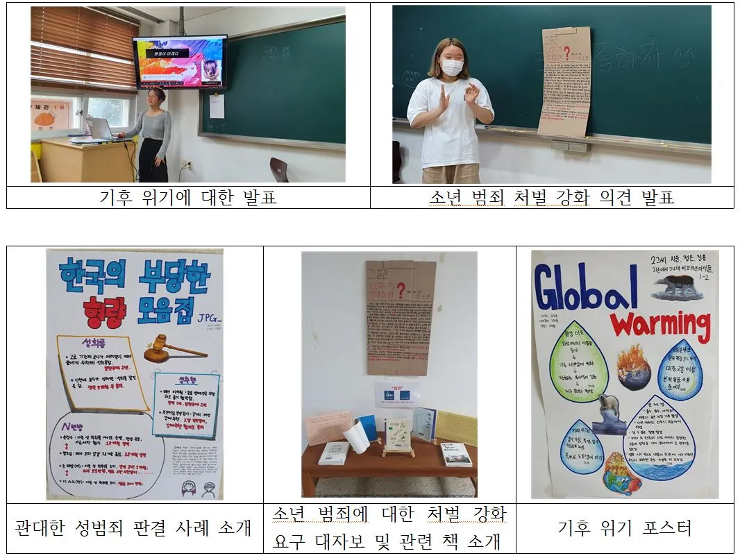 3개 반이 모두 비슷한 주제를 선정했는데, 특히 환경문제가 공통적으로 포함된 것을 보면서 기후 위기에 대해 학생들이 큰 관심을 가지고 있는 것 같아서 다행스럽기도 하였다. 그 외에 성차별 문제와 범죄에 대한 처벌강화를 선정했는데 요즘 계속 사회적인 이슈가 되고 있어 이 문제에 관심이 많은 것 같았다. 하지만 과거에 가장 큰 역사적 과제라고 할 수 있는 민주주의에 대해서 말하는 학생들이 거의 없다는 것을 보며, 역시 촛불 혁명을 겪은 세대에게 민주주의는 이미 일상이 되었다는 생각이 들었다.