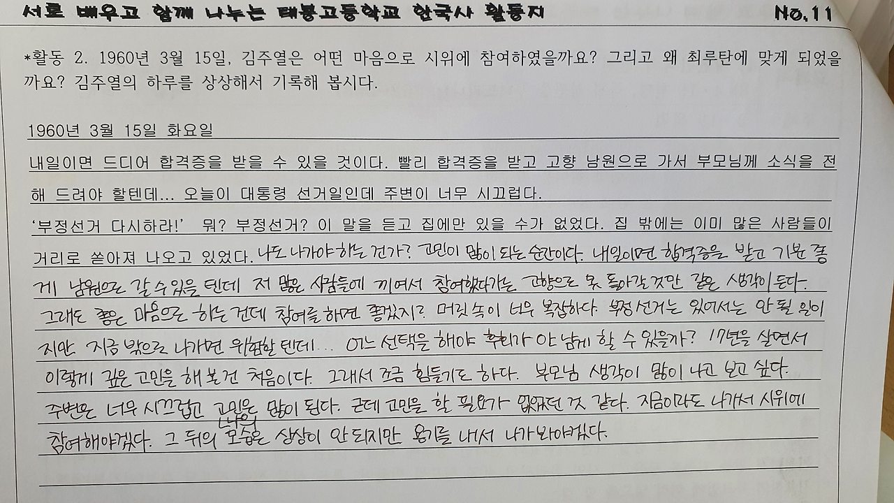 4·19 혁명 수업을 6월에 해야 하다니… 그것도 진도와는 전혀 상관없는 갑툭튀(갑자기 툭 튀어 나오다) 수업이다. 게다가 아직 친해지지도 않은 신입생들이고 심지어 거리두기로 따로따로 앉아있어 교실의 분위기는 여전히 어색했다. 교사와 학생들은 답답한 마스크를 쓰고 수업을 해야 하며, 모둠활동은 금지된 상황이다. 총체적 난국. 하지만 누굴 탓할 수 없는 상황이기에 주어진 조건에서 할 수 있는 것들을 고민하는 것밖에 방법이 없었다. 결국 활동지를 다시 고치고 수업 방식도 모둠활동을 빼고 개별 활동을 하는 것으로 수정하여 2차시 수업을 진행하였다.