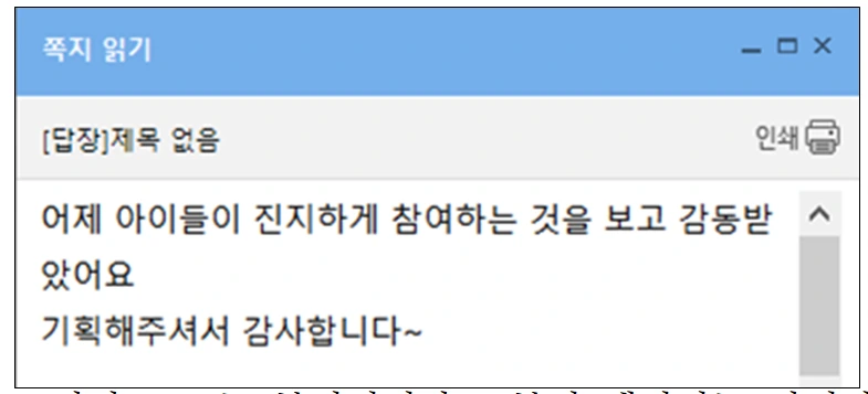 수업이 모두 종료된 직후에, 정보교과 교사가 내게 메시지를 보내왔다. 새로 전입해온 교사라 모르는 분이었지만 그분의 메시지는 짧지만 감동적이었다. 이런 격려와 응원이 더 받고 싶어져서인지 전체 교사들에게 수업 감사 메시지와 함께 교사의 수업소감도 부탁드려보았다. 소감을 많이 보내주셨는데 그 중 몇 개만 소개해본다.