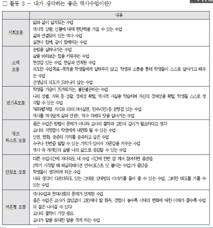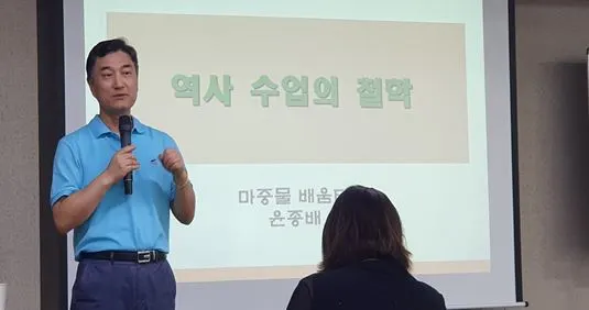 윤종배 선생님은 역사수업의 목표에 대해 이야기를 합니다. 다양한 목표가 제시될 수 있지만 수업을 통해서 학생들이 최종적으로 도달해야 하는 지점이 무엇인가에 대한 고민을 공유하며 시간은 흘러갑니다. 스스로 건강한 역사의식을 형성하는 것, 역사적 통찰력을 기르는 것, 민주시민을 양성하는 것, 삶을 공유하는 것, 배움의 즐거움을 얻는 것 많은 이야기가 이어집니다.
