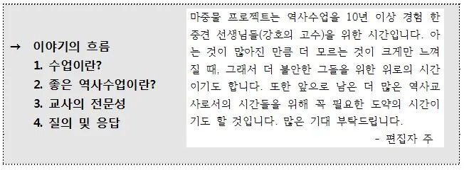 선생님은 이러한 역사수업을 ‘살아있는’ 역사수업이라 표현합니다. 살아있는 수업은 수업의 참여자들이 즐거움과 좋음을 느낄 수 있어야 합니다. 교사는 이러한 즐거움과 좋음을 매개할 수 있는 이끔의 역할을 해야 합니다. 또한 수업은 참여자의 다양한 고민과 표현이 자유롭게 펼쳐지고 교류하고 소통되어야 합니다. 이를 위해서 교사는 수업의 장을 의미 있게 설계해야 합니다. 또한 교류와 소통을 통해 얻는 의미가 공통의 것으로 상승하기 위해서 교사의 문제의식이 필요합니다. 학생들이 배움의 장에서 살아 생동할 수 있고, 그 생동함을 공통의 삶의 문제로 상승시키기 위해 교사 역시 생동해야 합니다. ‘살아있는’ 수업이란 참여자 모두의 생동입니다. 선생님은 ‘지금 우리 시대의 교사의 사명은 훌륭한 선원은 바다를 꿈꾸게 해야 한다.’는 어린왕자의 말로 이야기를 매조지합니다. 학생들이 생동할 수 있는 바다(배움의 공간), 물을 만난 고기에게 생동성을 체험하게 하고 그 체험을 토대로 또 다른 생동을 희구하게 하는 매개자로서 역사교사, 그 책무에 대한 많은 고민을 하게 됩니다.