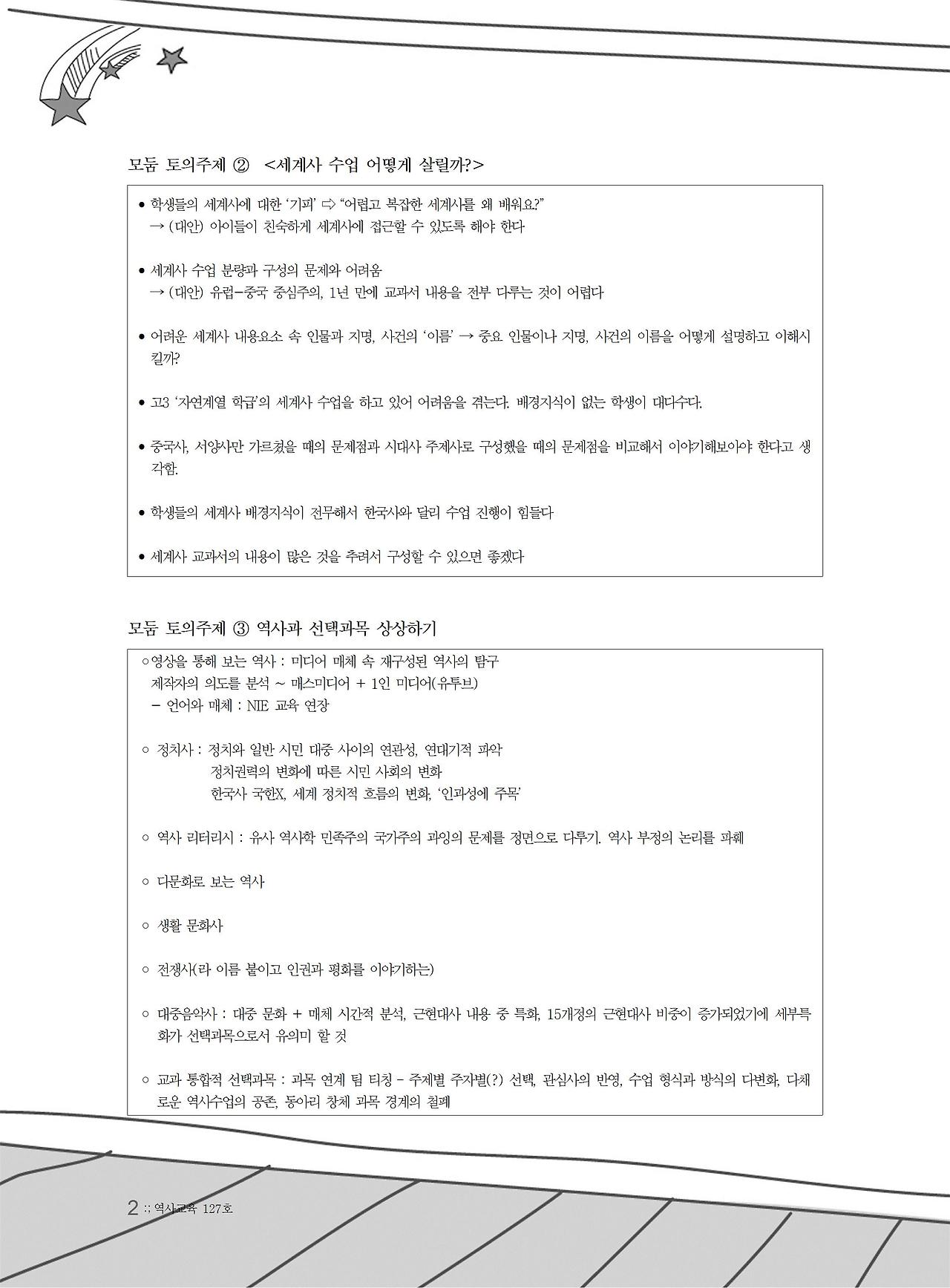 본 후기는 교사들이 열띠게 토론하였으나 나누지 못했던 내용들을 주제 별로 정리한 것을 나누면서 마치고자 한다. 10회, 2년 간의 ‘역사교사, 교육과정을 디자인하다’ 행사의 논의들이 앞으로의 역사교육을 진일보 위한 역사교사의 자발적인 고민과 성찰의 결과물임을 기억하면서.