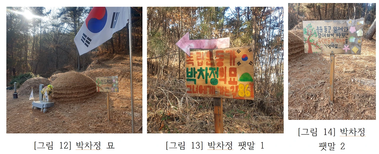 하지만 그때 선생님들이 감탄사를 연발하며 카메라를 꺼내게 했던 것은, 박차정의 묘소로 가던 길에 놓인 팻말들이었다. 아이들의 작품으로 보이는 이 깜찍한 팻말들을 보니, 우리 역사 교사들이 밀양에서 보고 느낀 것들을 앞으로 어떻게 수업에 녹여내야 할지 생각해야 할 과제를 얻어가게 된 것 같았다.