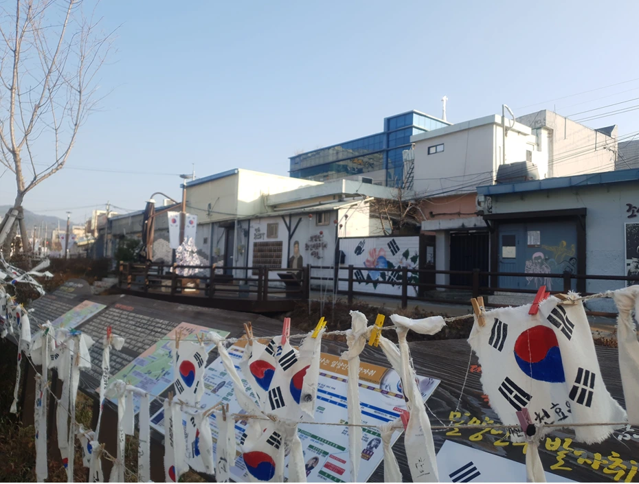 셋째 날 코스들은 주로 밀양의 시내 한복판에 모여있었다. 발제를 맡으신 쌤들의 말마따나, 너 나 할 것 없이 독립운동에 다같이 뛰어들었던 밀양 특유의 의열투쟁이 드러나는 부분이었다. 특히 의열기념관으로 향하던 천변가에는 태극기와 벽화로 꾸며진 해천항일운동 테마거리가 조성되어 있어 분위기를 더해주었다. 한편으로는 버스가 지나다니는 시내 한복판에서 약 50명이 모여 이동하면서 발제를 듣고 있으니, 주변 시민들이 호기심 어린 시선으로 바라보기도 했다.