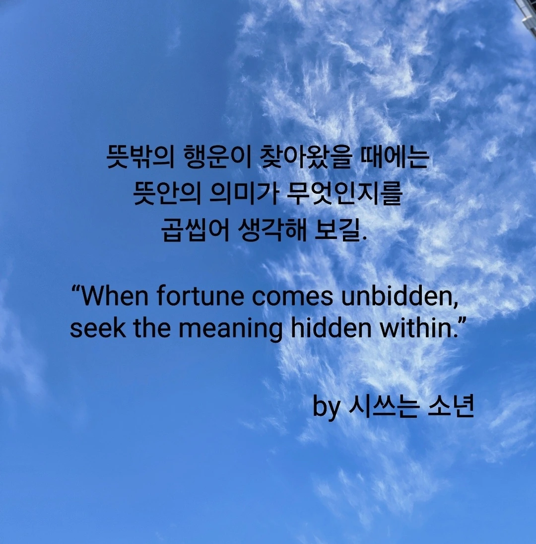 갑자기 행운이 찾아온다면 정말 기분 좋은 일일 것입니다. 잠시 그 순간에 심취해 보는 것도 좋으나 그 안에 무엇이 있는지, 어떤 의미가 있었는지 생각해 볼 필요도 있습니다. 모든 것은 허투루 이루어지는 것은 없으니까요.