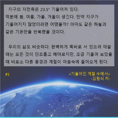 그러나 포기하지는 말자. 길을 잘못 들었을 때도 천천히 지도를 바라보고 다시 길을 찾아 나서면, 비록 돌아가는 시간이 필요할지라도 언젠가는 제 방향을 되찾게 된다. 지구의 자전축도 정주행이 아니다. 23.5도 기울어져 있기 때문에 우리는 사계절을 느끼고, 그 변화 속에서 자연이 주는 아름다움을 발견하며 살아간다. 우리는 그 계절이 늘 같고 반복된다고 여기며 살아왔지만, 마음이 기울어진 순간에 맞이한 겨울은 평소보다 훨씬 혹독했고, 그 혹독함을 견디기 위해 발버둥 치던 마음은 여느 여름보다 더 뜨겁기도 했다.
