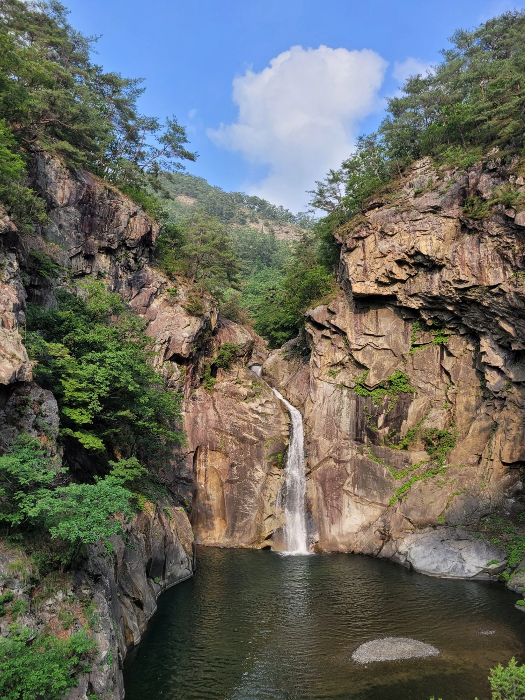 쏟아지는 폭포아래 고즈넉이 자리 잡아