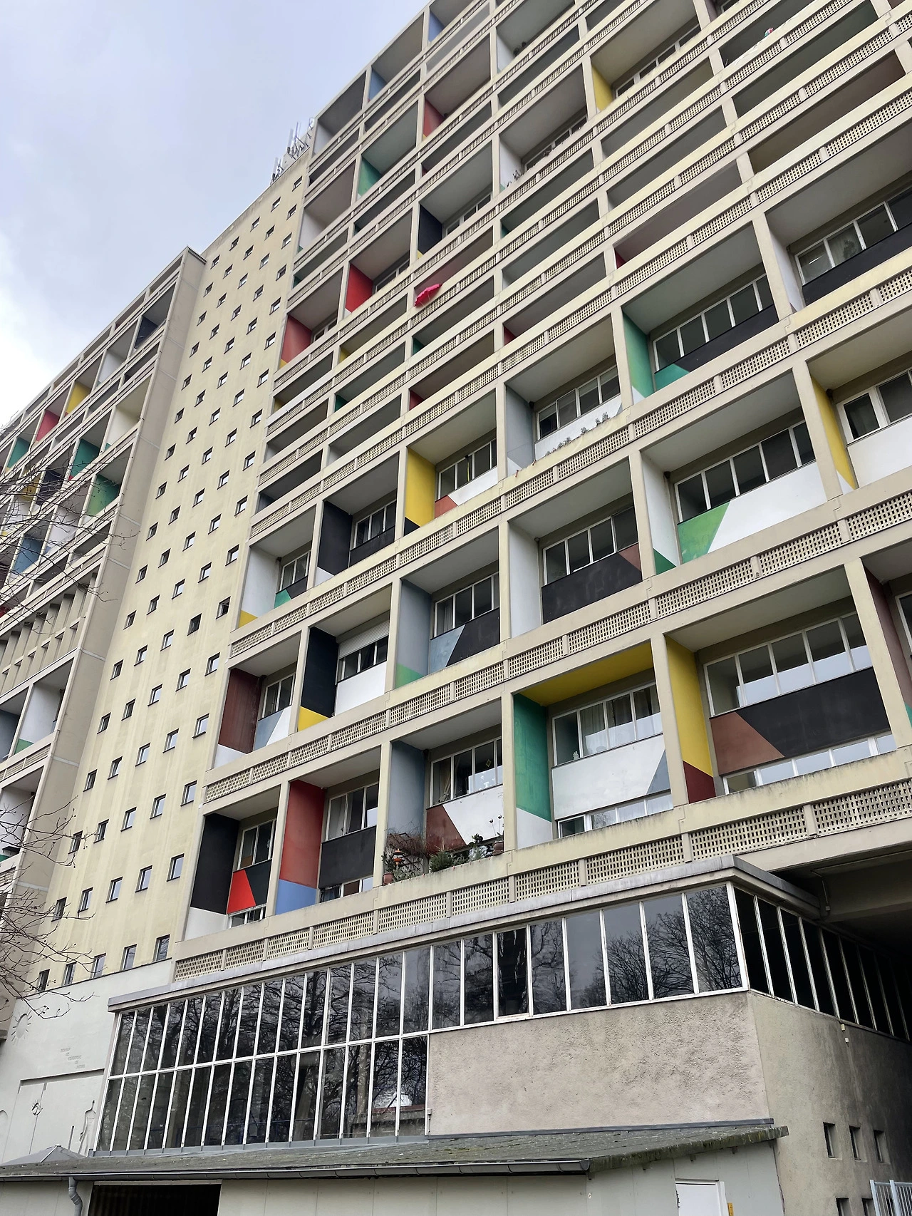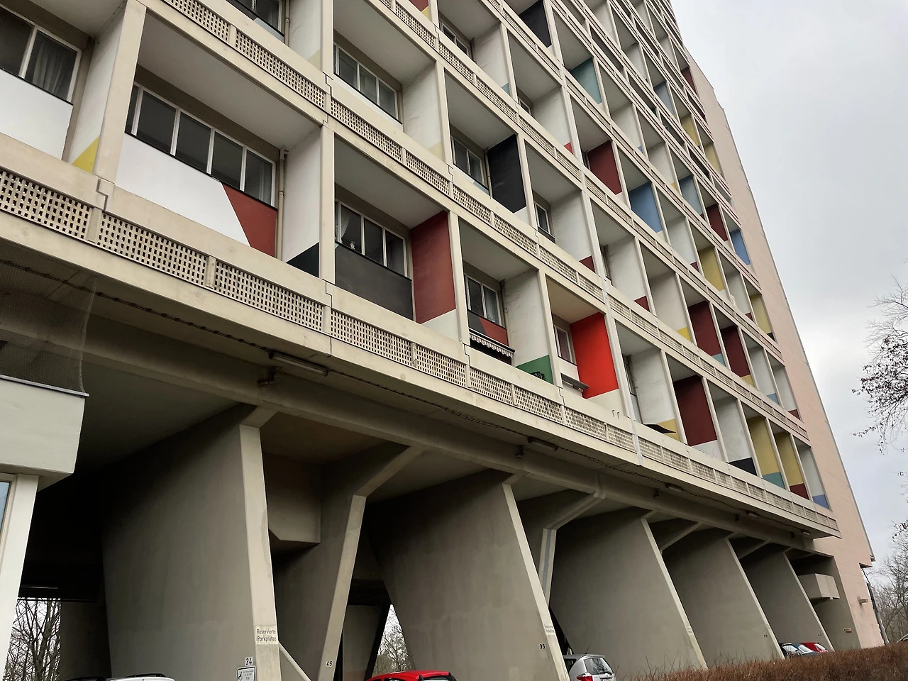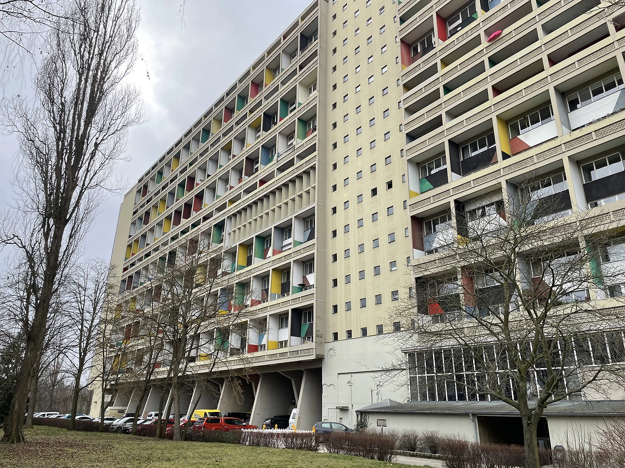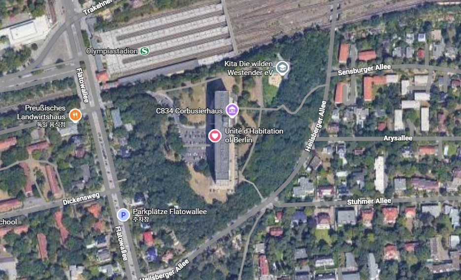 피흐미니의 유니테 다비타시옹과 연결하여 베를린 유니테 다비타시옹으로 넘어온다. 피흐미니에 비해 입면에 색채감이 더 화려하고 지상층의 세탁실과 작업실 등 다양한 문화시설들이 추가로 건설된 듯하다. 피흐미니와 다르게 난간은 석재로 이루어져 있었다. 입면의 수직 루버들은 내부의 리테일 층을 나타낸다. 공용부에 리듬감 있는 빛이 어떻게 들어올지 궁금하다.