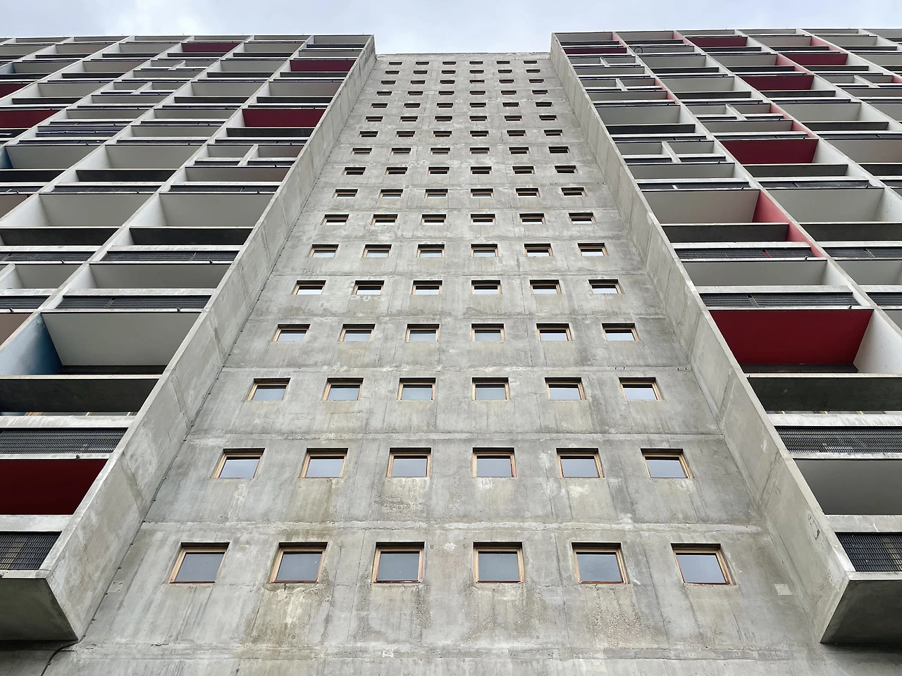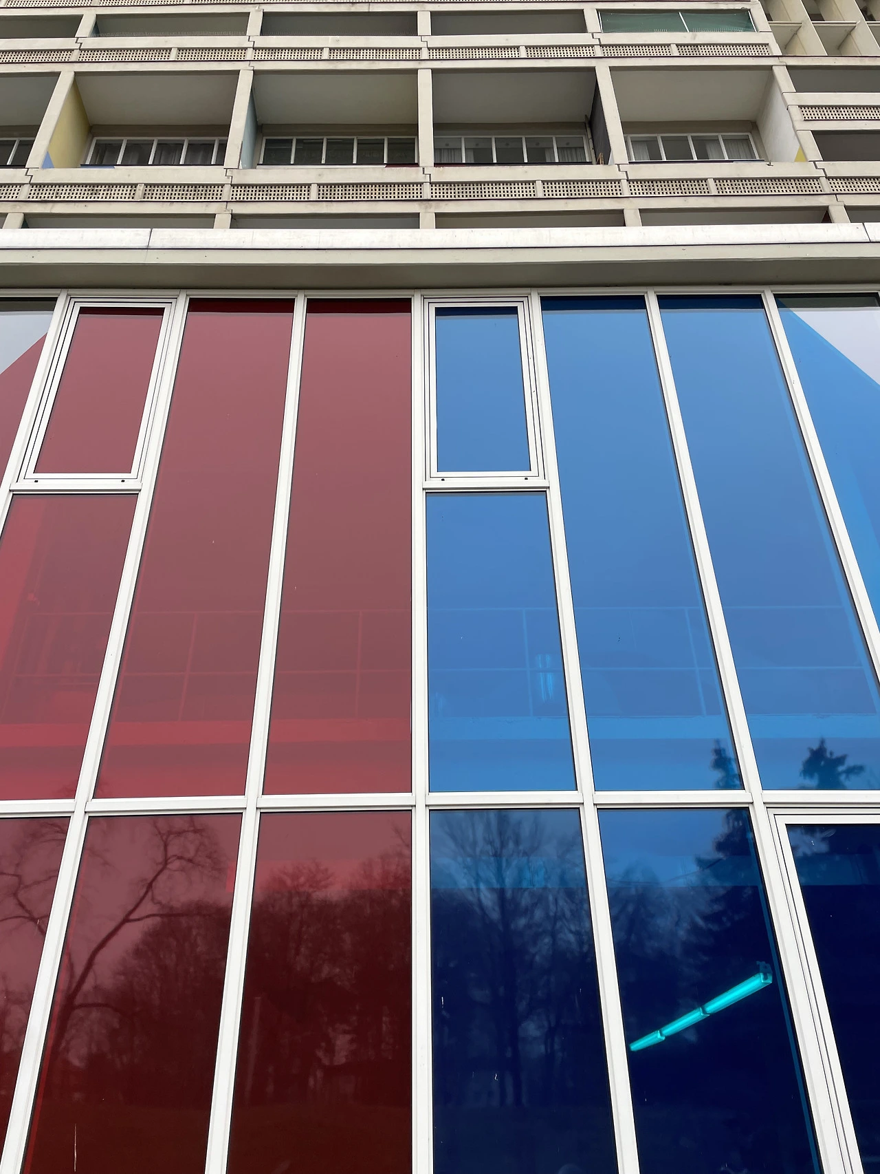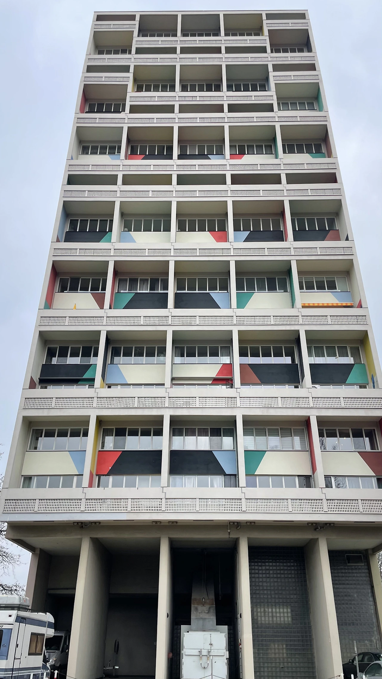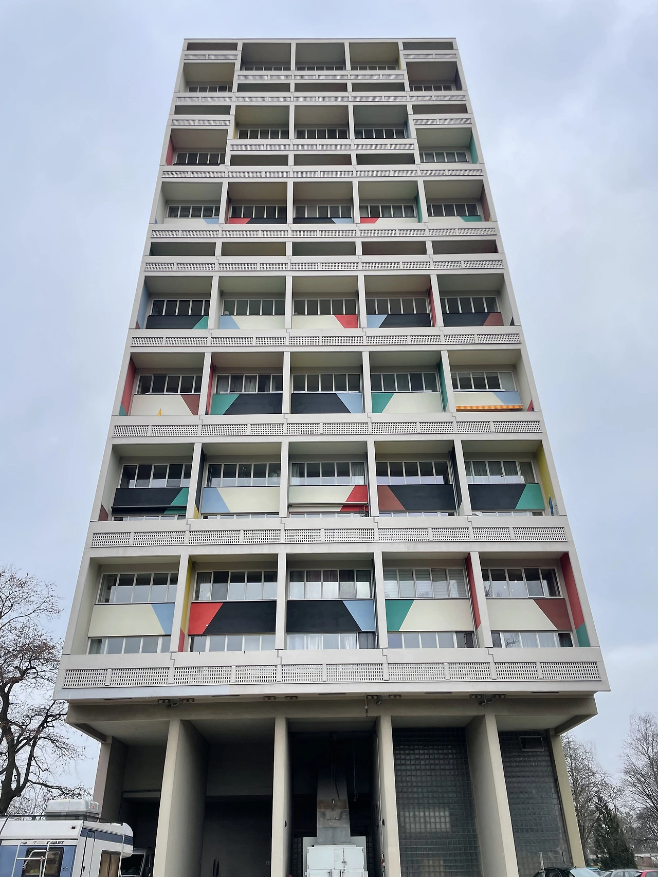 피흐미니의 유니테 다비타시옹과 연결하여 베를린 유니테 다비타시옹으로 넘어온다. 피흐미니에 비해 입면에 색채감이 더 화려하고 지상층의 세탁실과 작업실 등 다양한 문화시설들이 추가로 건설된 듯하다. 피흐미니와 다르게 난간은 석재로 이루어져 있었다. 입면의 수직 루버들은 내부의 리테일 층을 나타낸다. 공용부에 리듬감 있는 빛이 어떻게 들어올지 궁금하다.