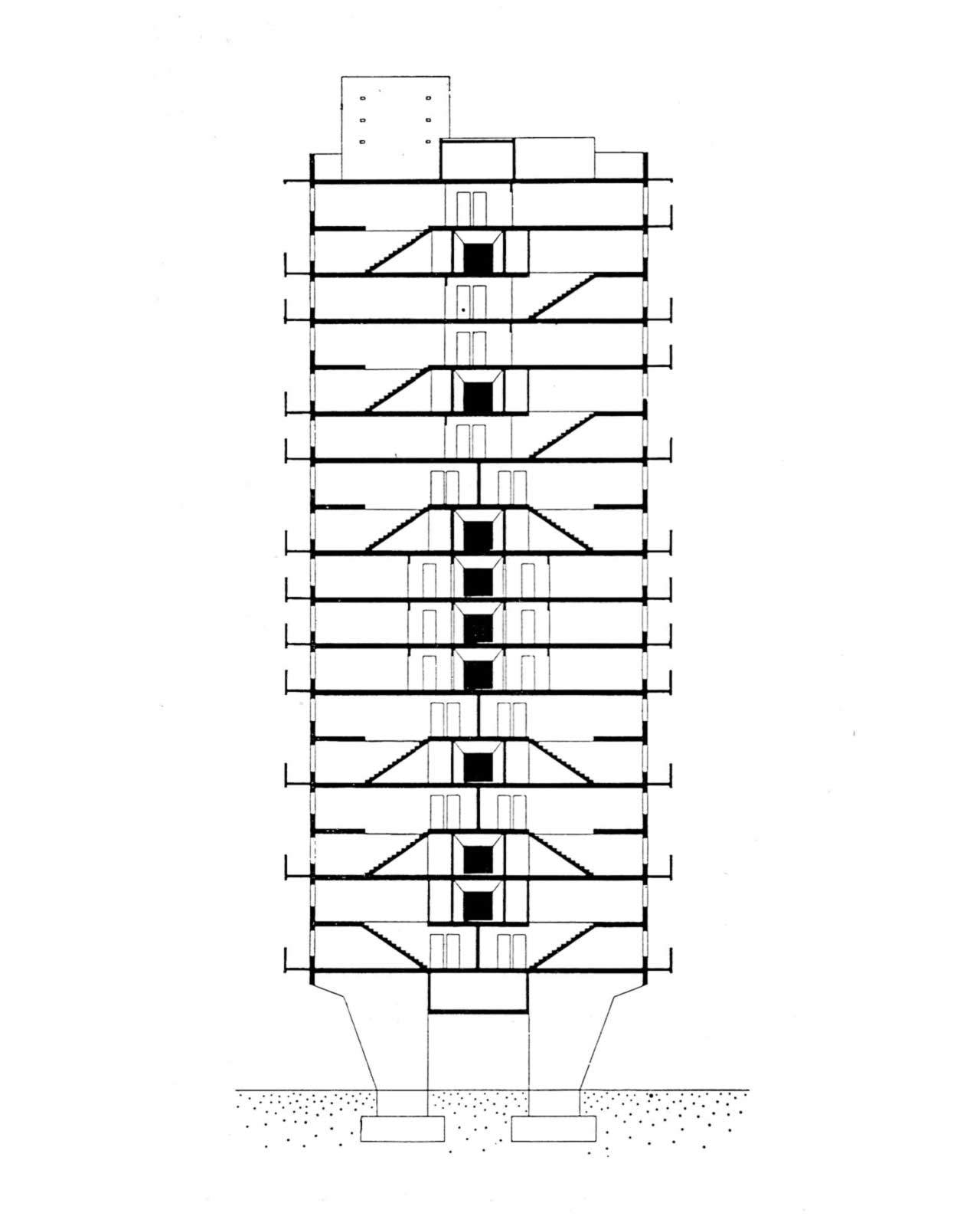 그 시대에 재즈가 흘러나오는 크루즈와 같은 모습을 자아낸다. 복층 단위세대의 내부 주거 유닛들을 예측할 수 없는 입면을 가지고 있다. 주거공간을 하나로 연결해 주는 계단실 공간과 공용공간은 입면에서도 예측가능하다.