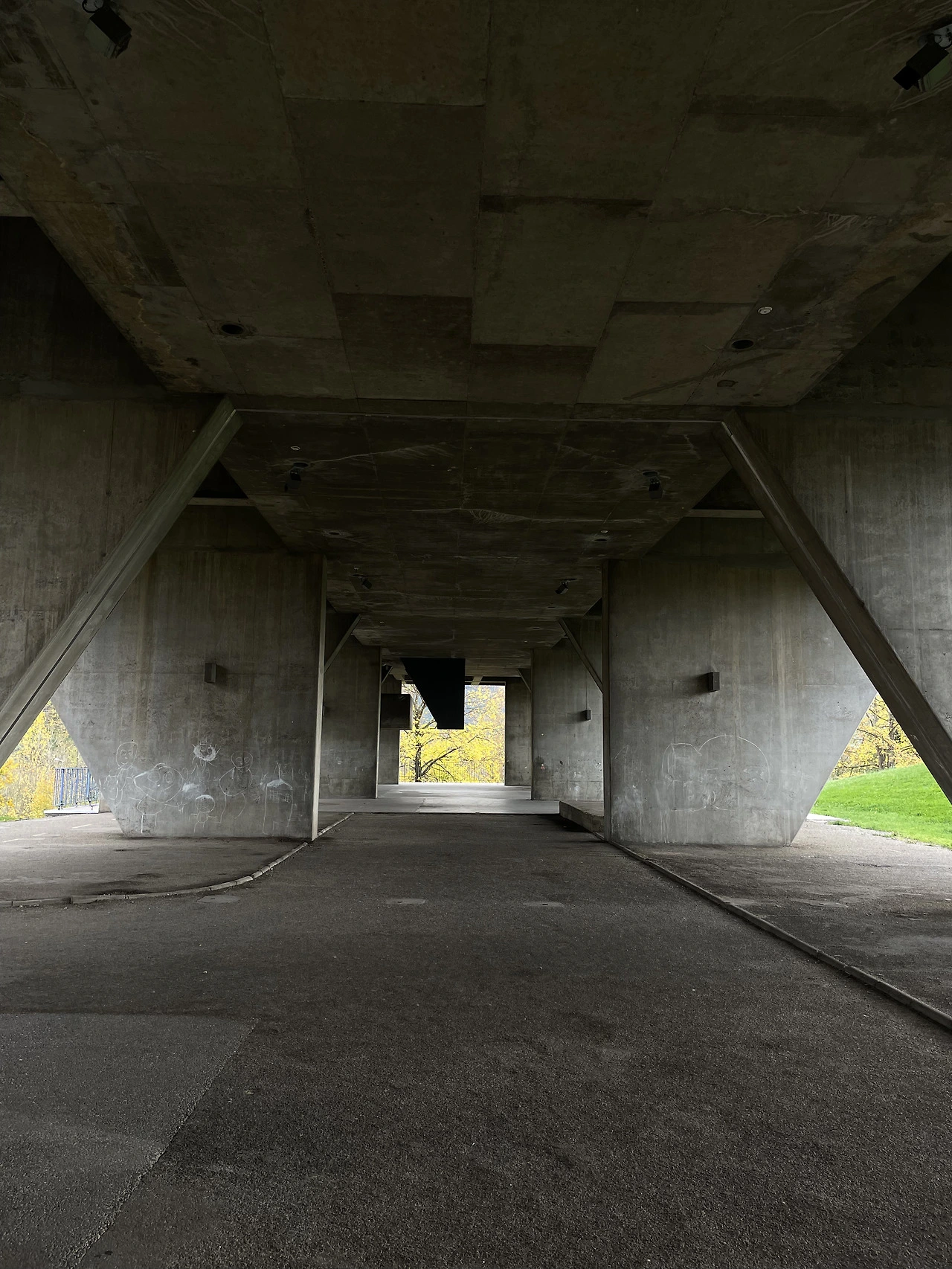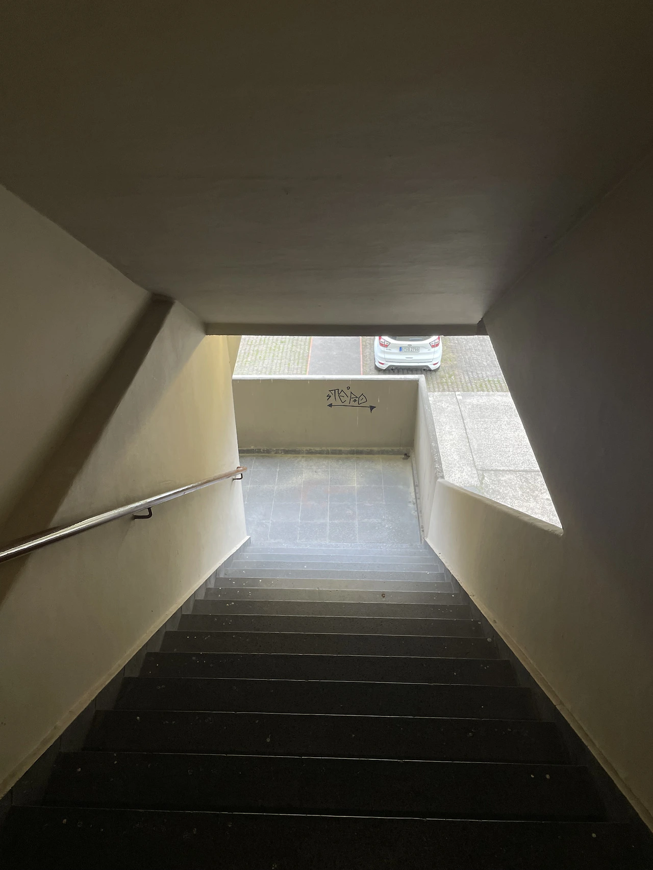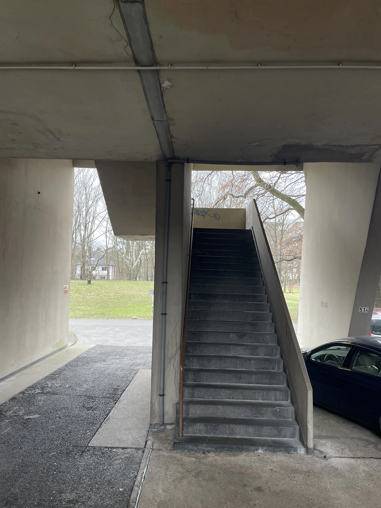 내부계단실을 따라 내려오면 외부로 통하는 계단으로 내려오게 된다. 건물과 연결된 계단마저 조형감이 묘하게 드러나면서 선박으로 들어가는 계단을 떠오르게 된다. 건물은 노출 콘크리트로 따뜻하거나 아늑한 인상은 아니다. 브루탈과 탈 모더니즘 등 여러 요소들이 복합적으로 나타내면서 그 과도기적인 과정에 있는 듯하다.