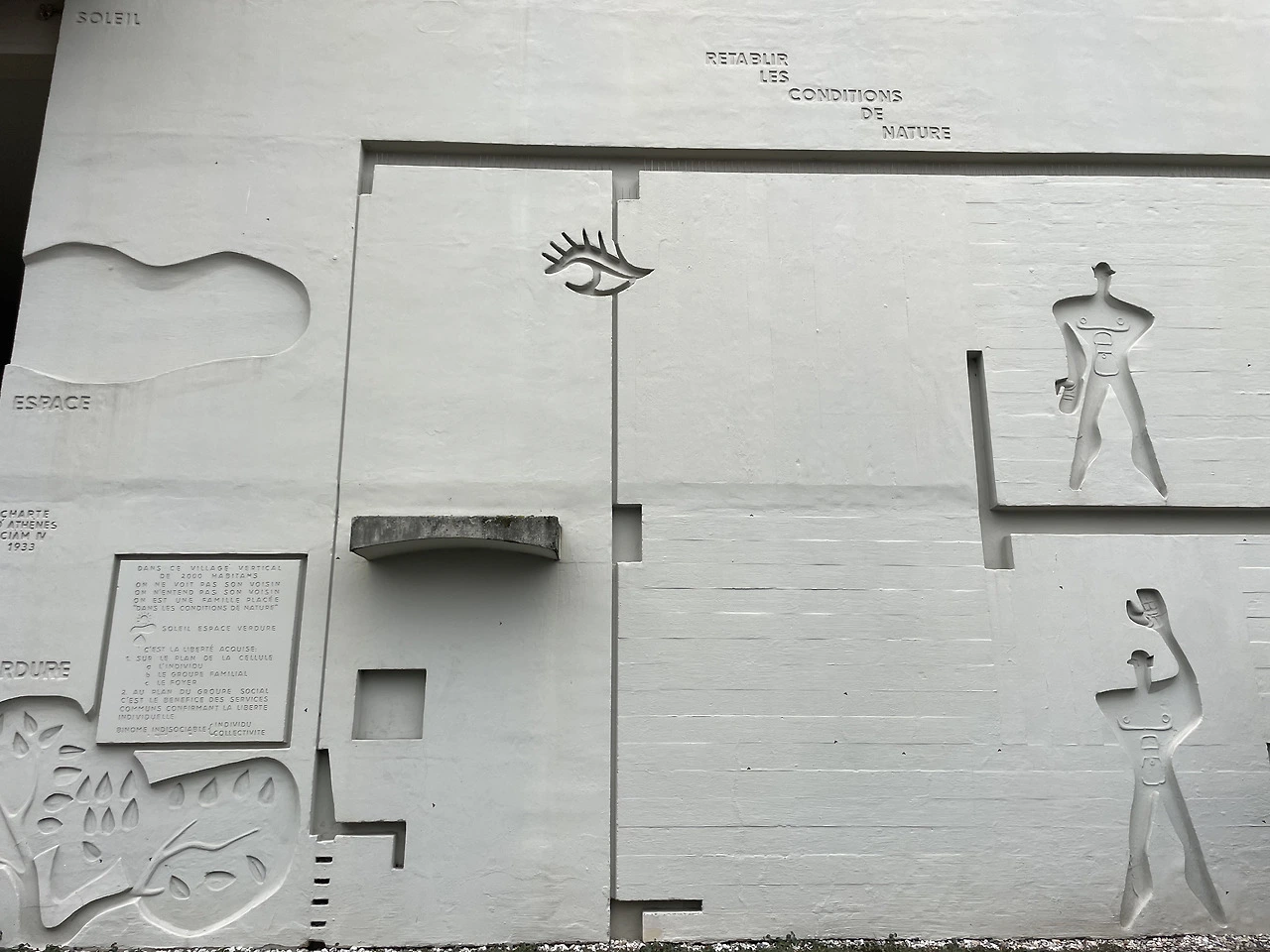모든 유니테 다비타시옹의 외관은 코르뷔의 모듈러와 그 외 것들이 조각되어 있다. 조각들은 코르뷔의 생각에 들어온 것만 같다. 회화에서 주로 영향을 받은 코르뷔는 자유로운 하늘과 생명과 자연을 뜻하는 나무 등 회화 속에 자주 등장하는 기호들을 건물 입면에서 표현해 왔다.