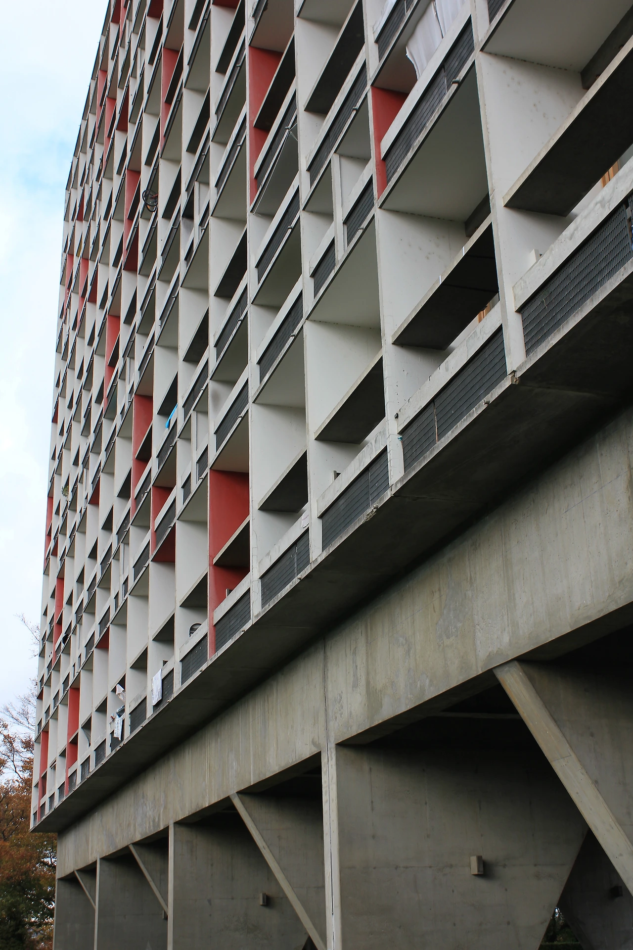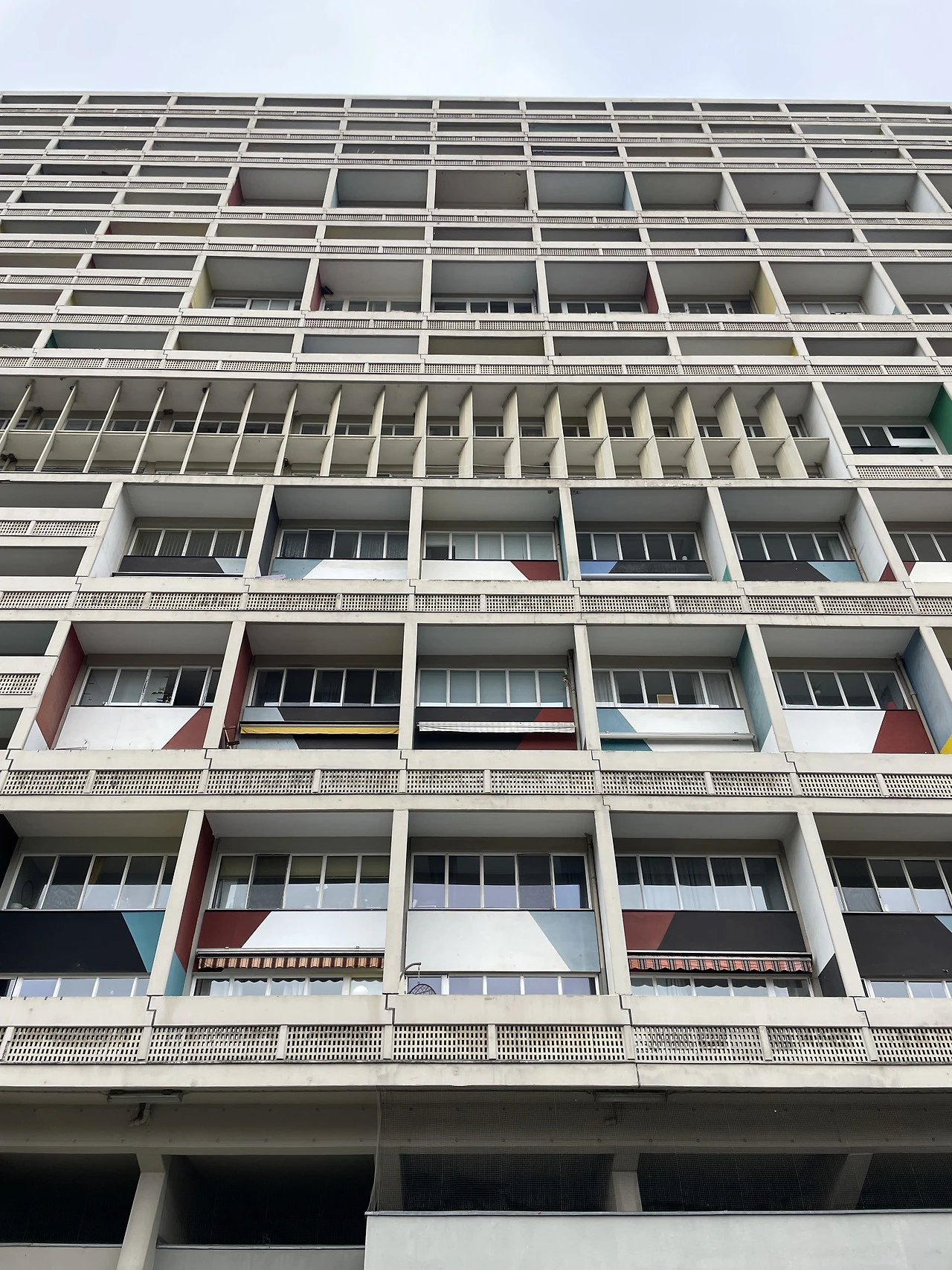 슬라브의 띠뿐만 아닌 난간을 이루는 띠, 복층을 따라 연결되는 입면 선들은 내부를 상상하지 못하는 입면을 자아낸다. 피흐미니의 난간은 철로 끼워져 있었다. 재료를 건물마다 다르게 한 이유는 잘 모르겠다. 하지만 마르세유의 건물은 석재로 구멍이 정교하게 뚫린 난간에 빛이 리듬감 있게 들어오는 걸 확인할 수 있다.