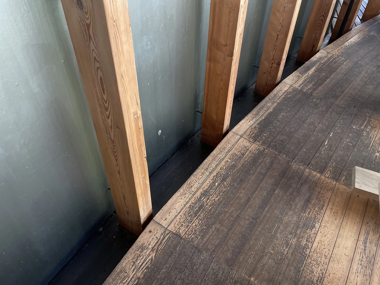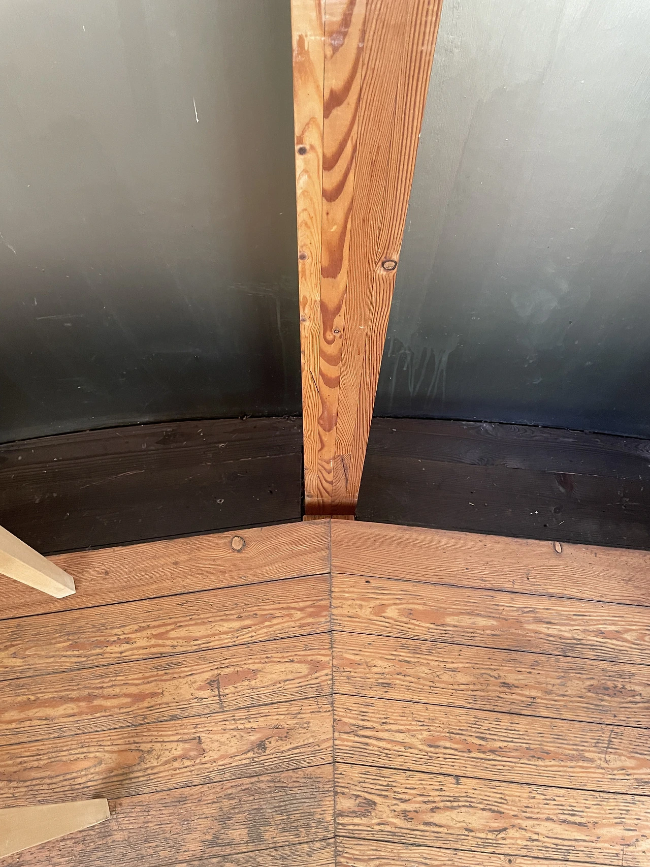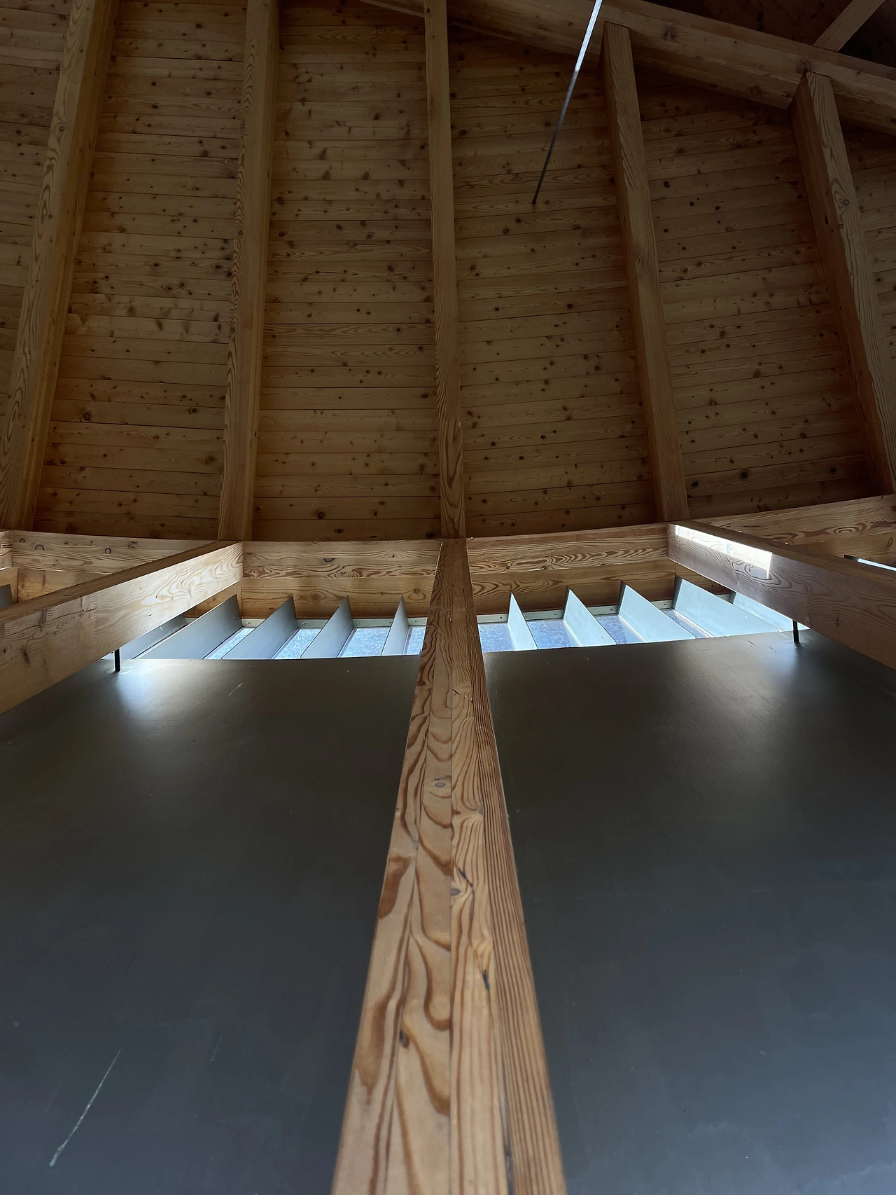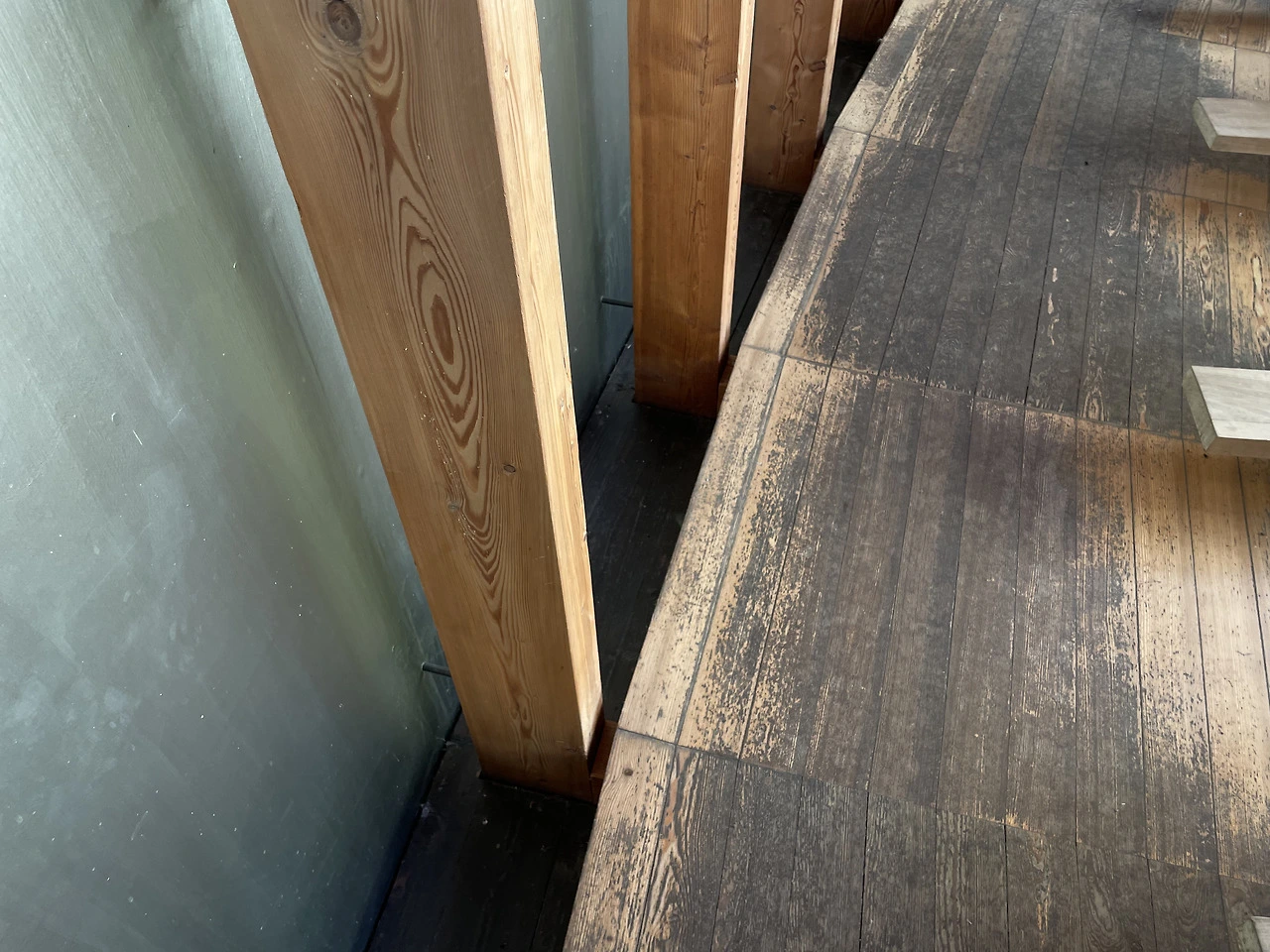 슬라브 또한 벽과 목재 프레임과 거리를 두고 존재한다. 벽과 슬라브 사이는 200mm가량 띄워져 있다. 정말 건물을 '배'로 본 것만 같은 기분이다.