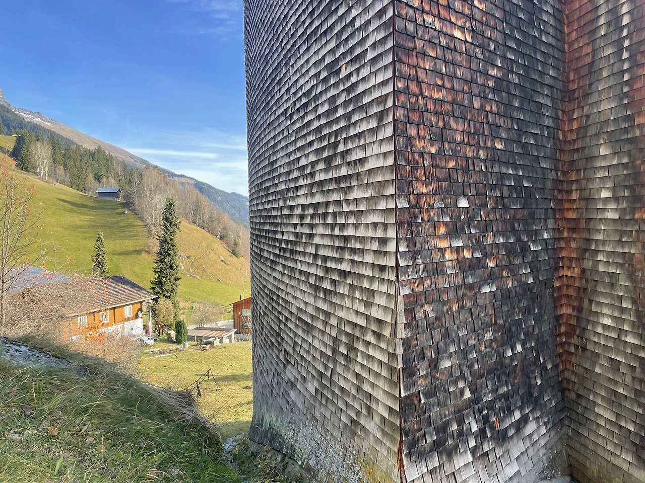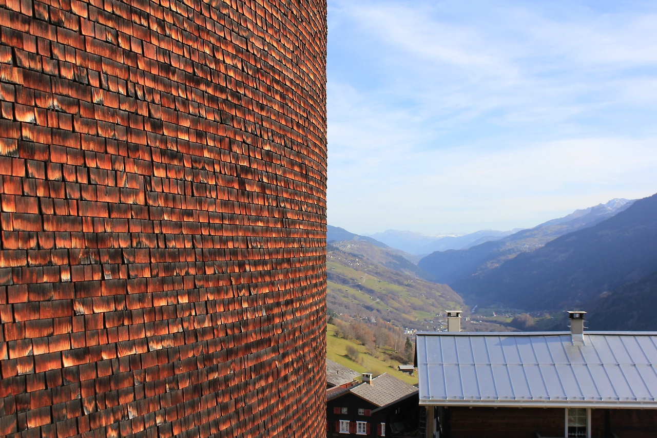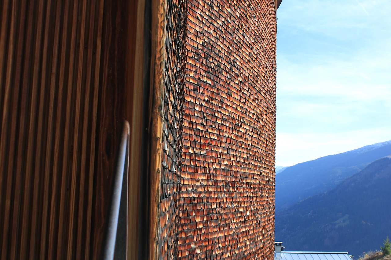 의도적으로 탄화된 외부 우드는 스위스의 자연과 시간성을 있는 그대로 드러내며 자연 속에서 점차 파괴되는 듯한 질감을 드러낸다.