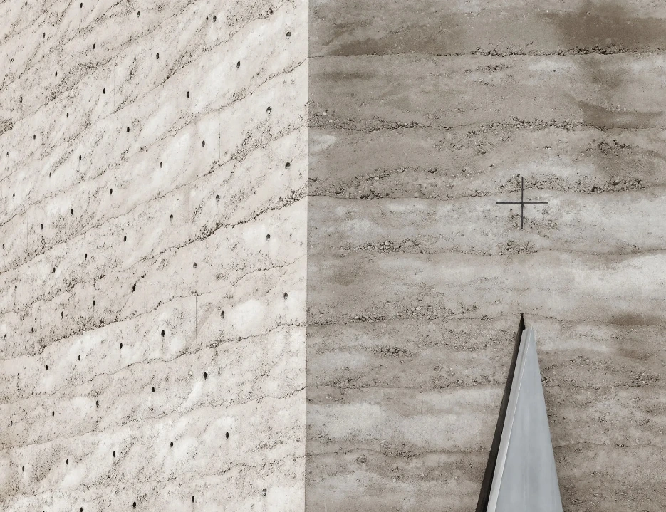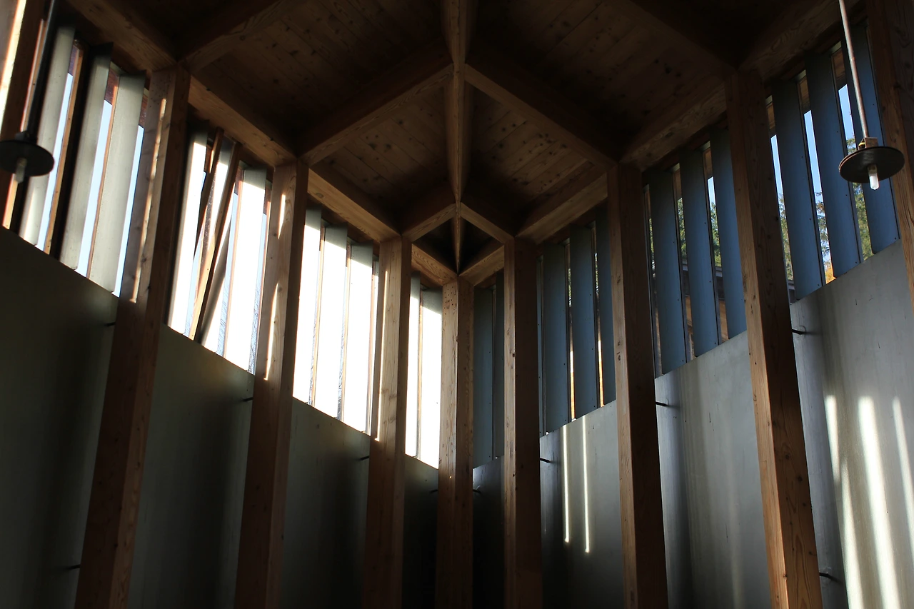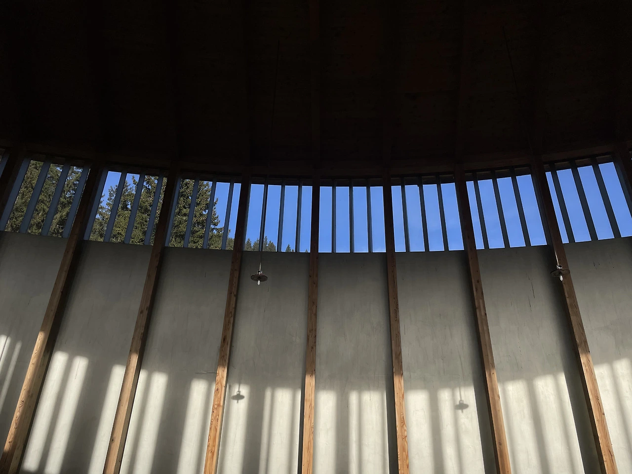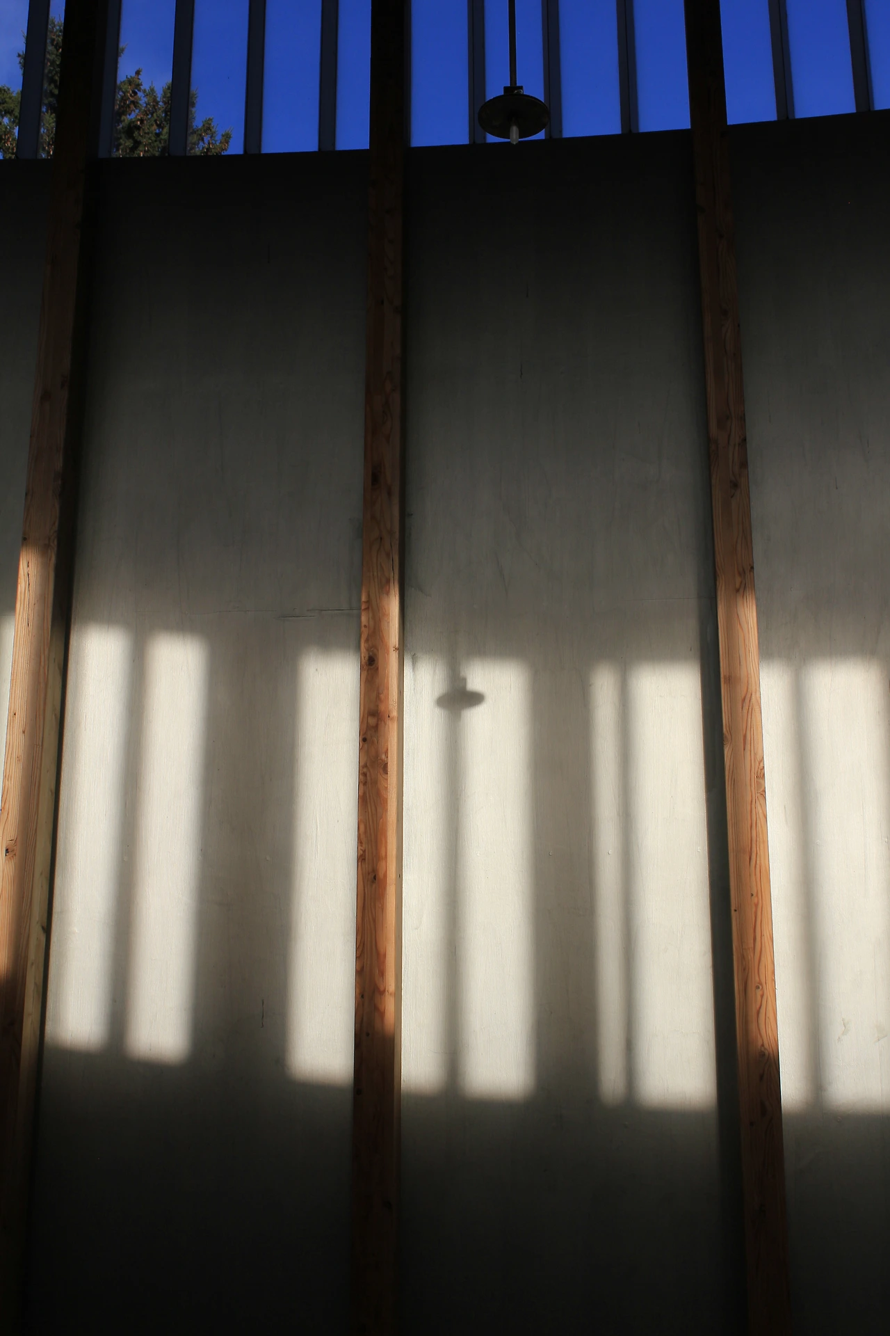 불에 타며 연기들은 마치 약속이라도 한 듯 천장의 오큘러스로 빠져나갔다. 마치 캠프파이어의 한 장면과 같았다. 외벽은 이렇게 한 줄 한 줄 쌓아가며 자연을 담아냈다. 콘크리트 타설 중 거푸집 폼타이 구멍에 유리봉을 넣어 간결하고 얕은 빛이 내부로 들어오게 하였다.