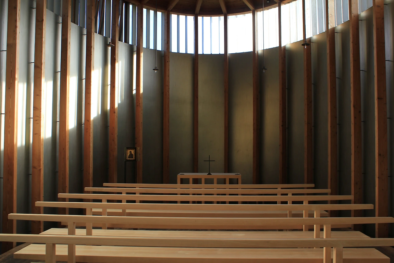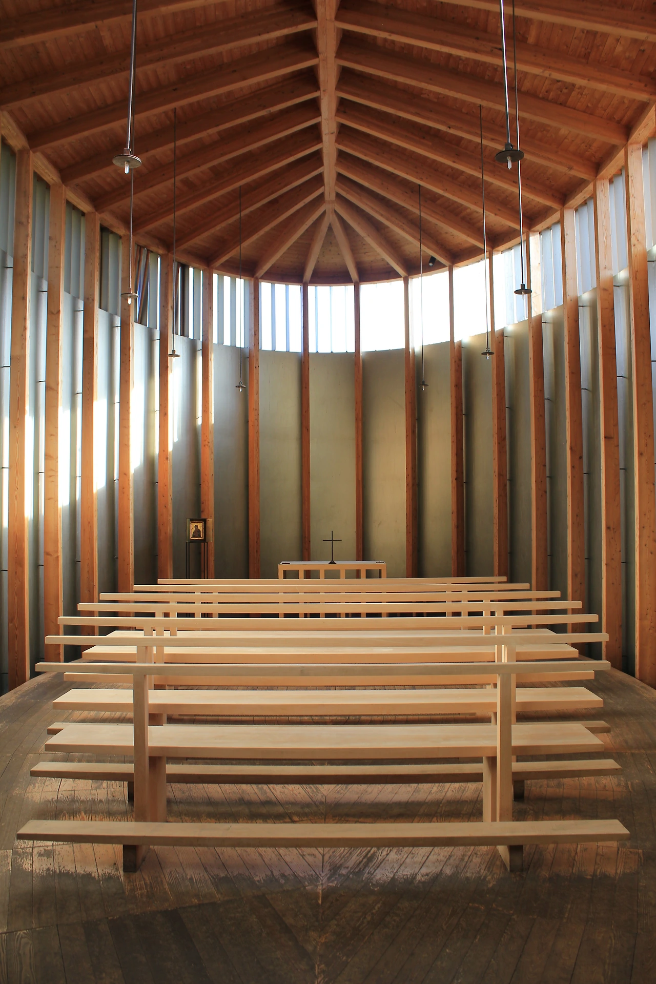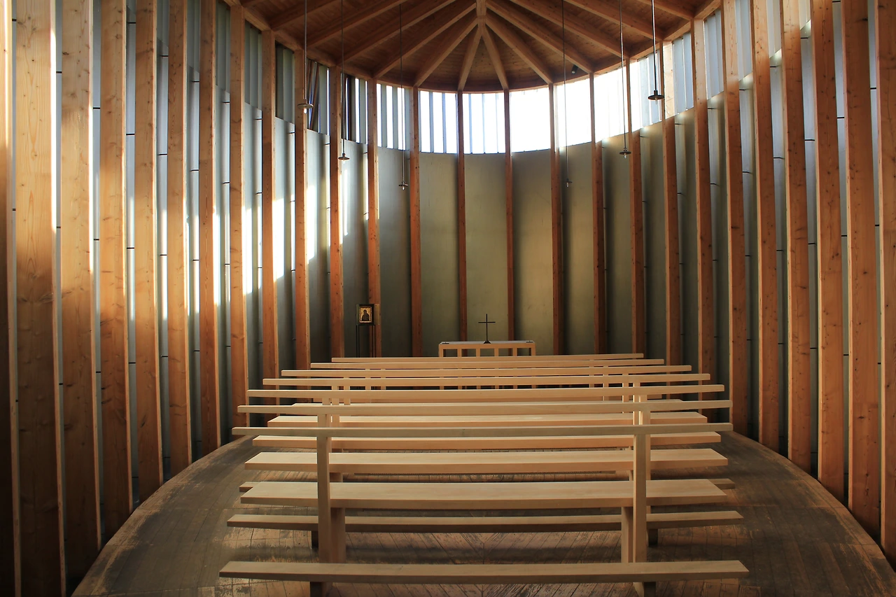 나무 프레임과 촛불 조명들은 합판벽에 그림을 그려낸다. 해가 뜨고 지는 과정은 성당 내부에서 볼 만할 것이다.