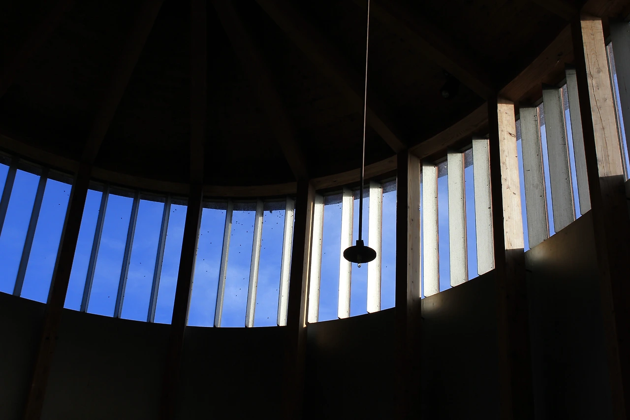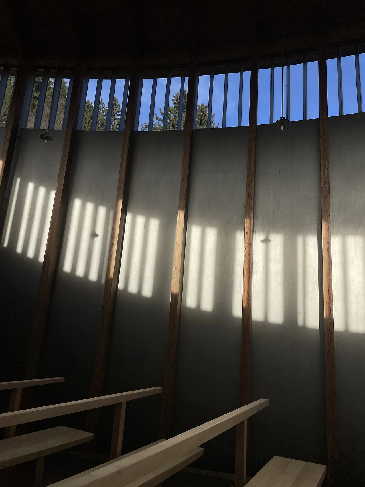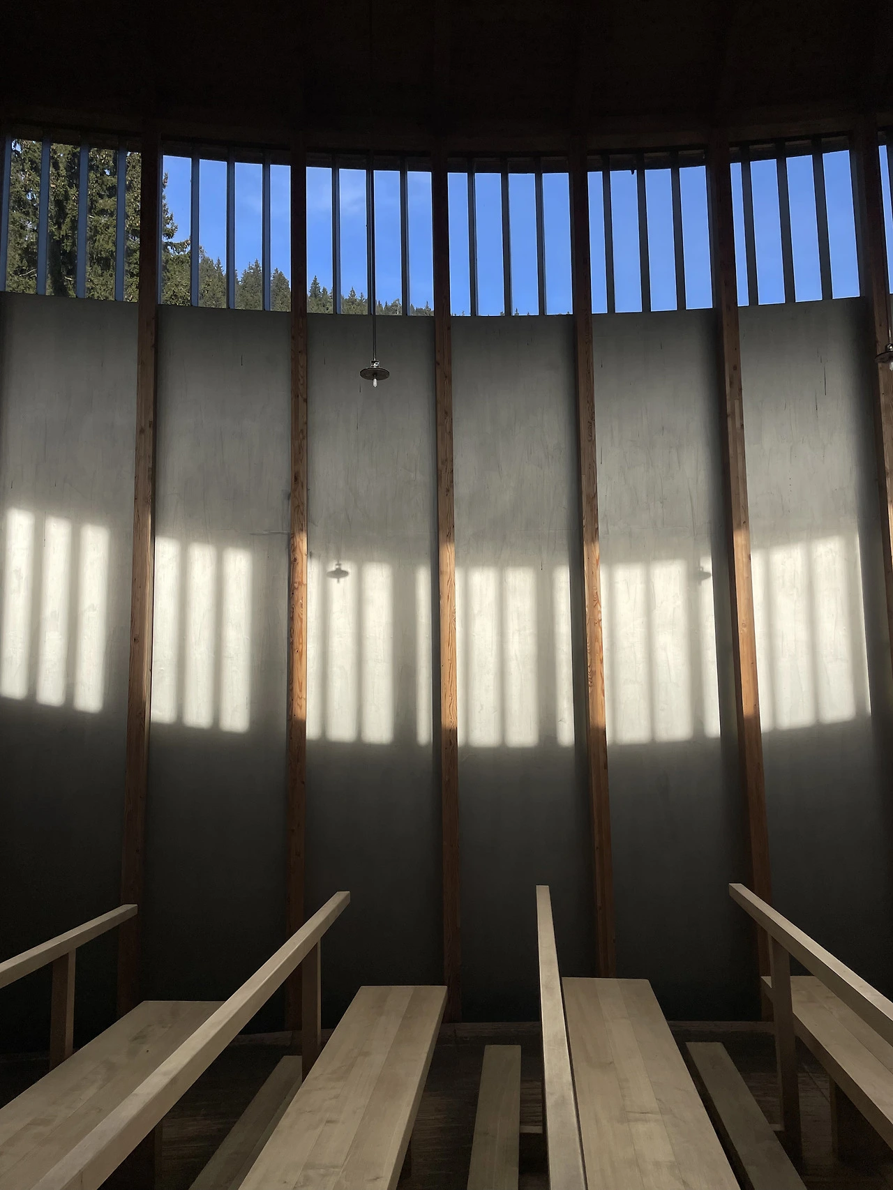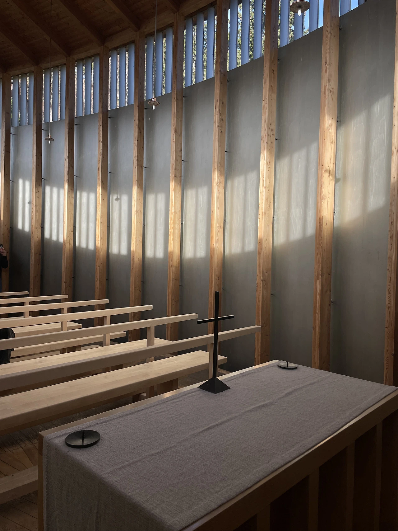 내부에 들어선 순간 정말 외부가 산이 아닌 바다라고 믿을 정도였다. 남측 고측창에서 들어오는 빛은 북측 벽에 가느다란 목재 프레임들을 피해 리듬감 있는 빛이 들어온다. 내부는 피터줌터의 손길을 직접 느낄 수 있다. 노출된 목재 구조들과 합판, 줌터의 촛불 조명부터 도어 손잡이까지