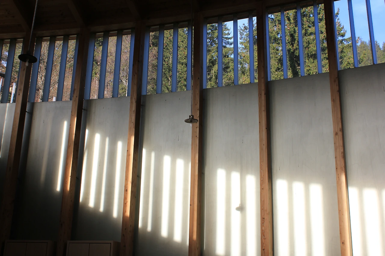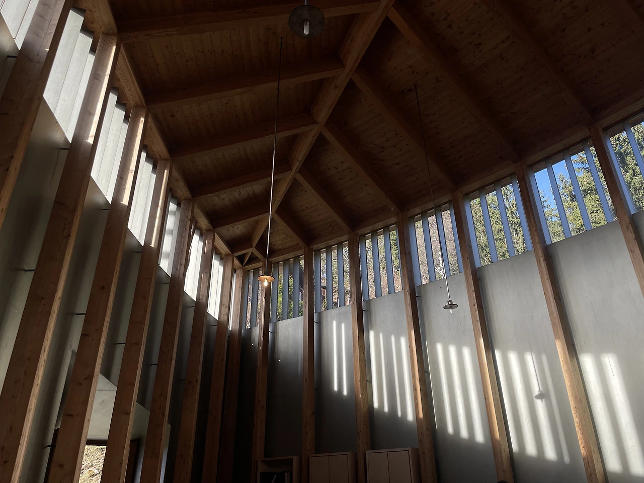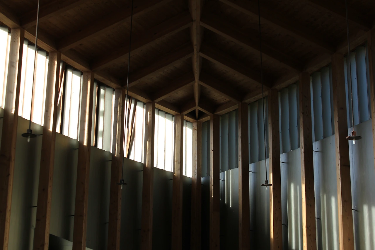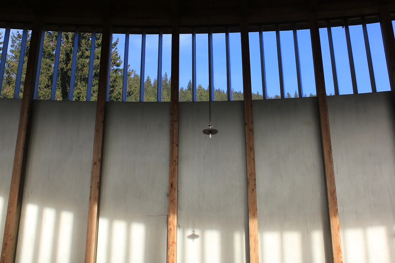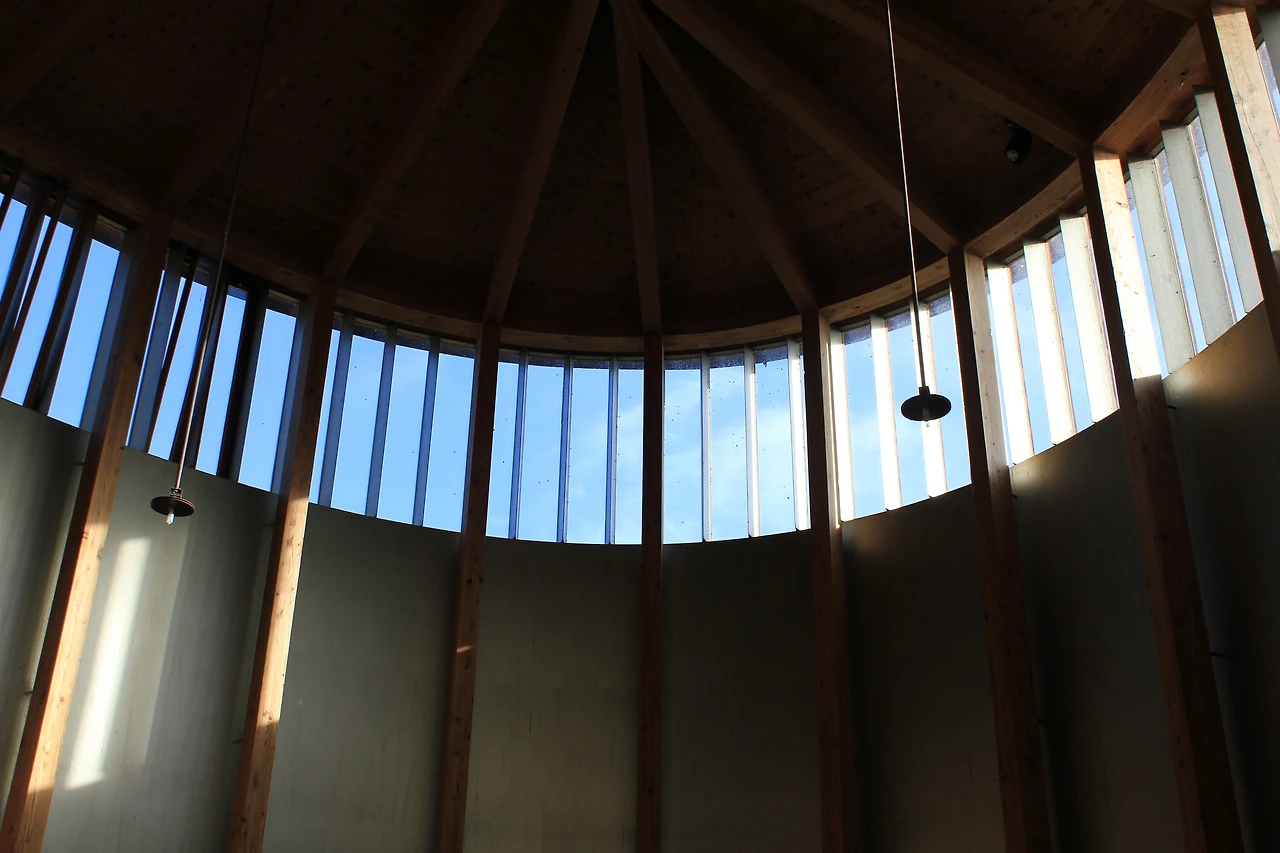 내부에 들어선 순간 정말 외부가 산이 아닌 바다라고 믿을 정도였다. 남측 고측창에서 들어오는 빛은 북측 벽에 가느다란 목재 프레임들을 피해 리듬감 있는 빛이 들어온다. 내부는 피터줌터의 손길을 직접 느낄 수 있다. 노출된 목재 구조들과 합판, 줌터의 촛불 조명부터 도어 손잡이까지