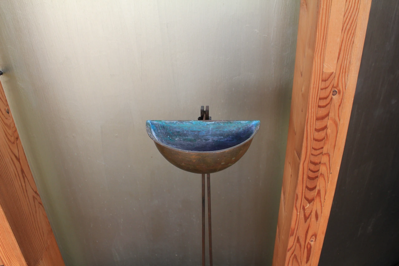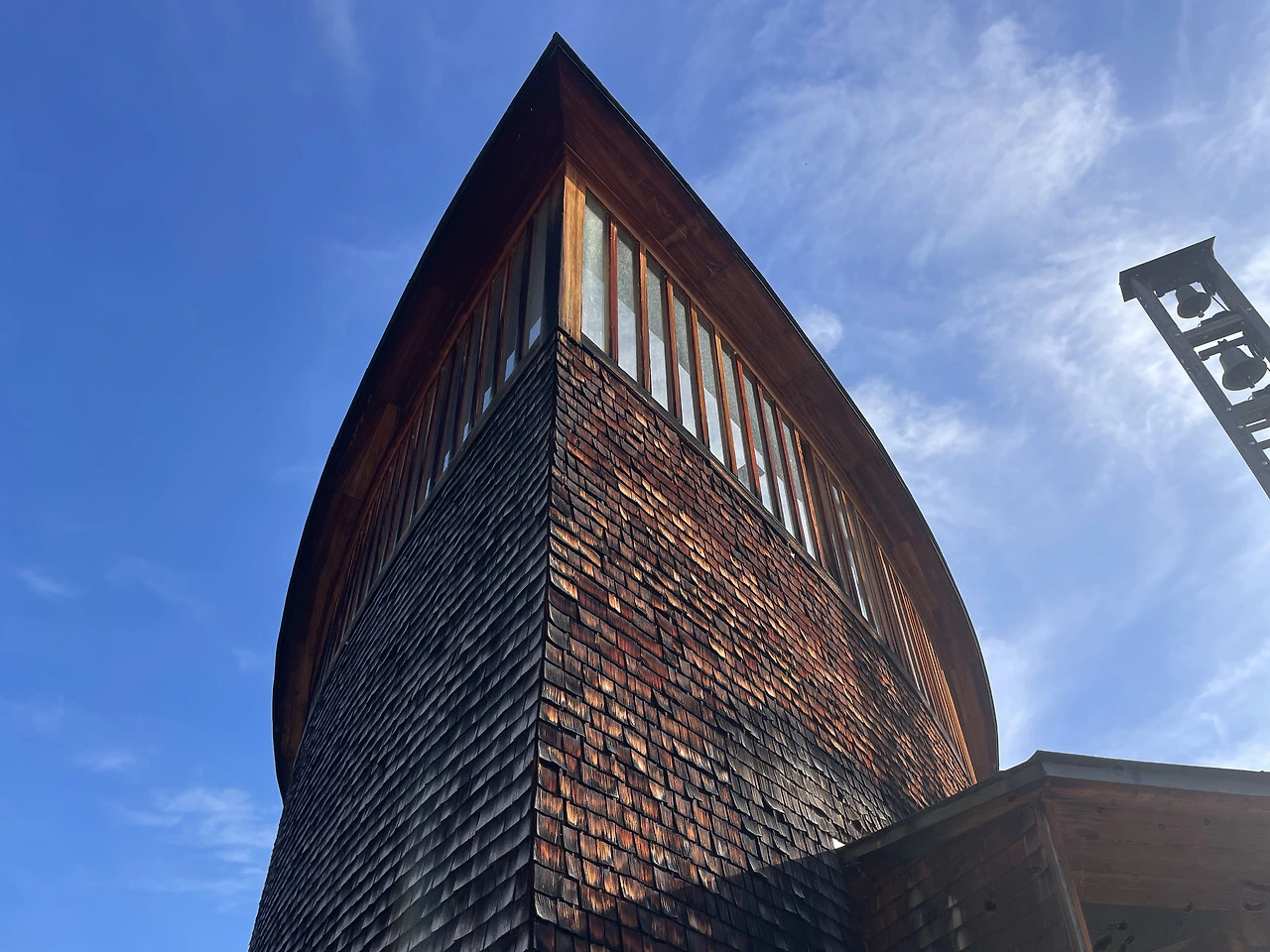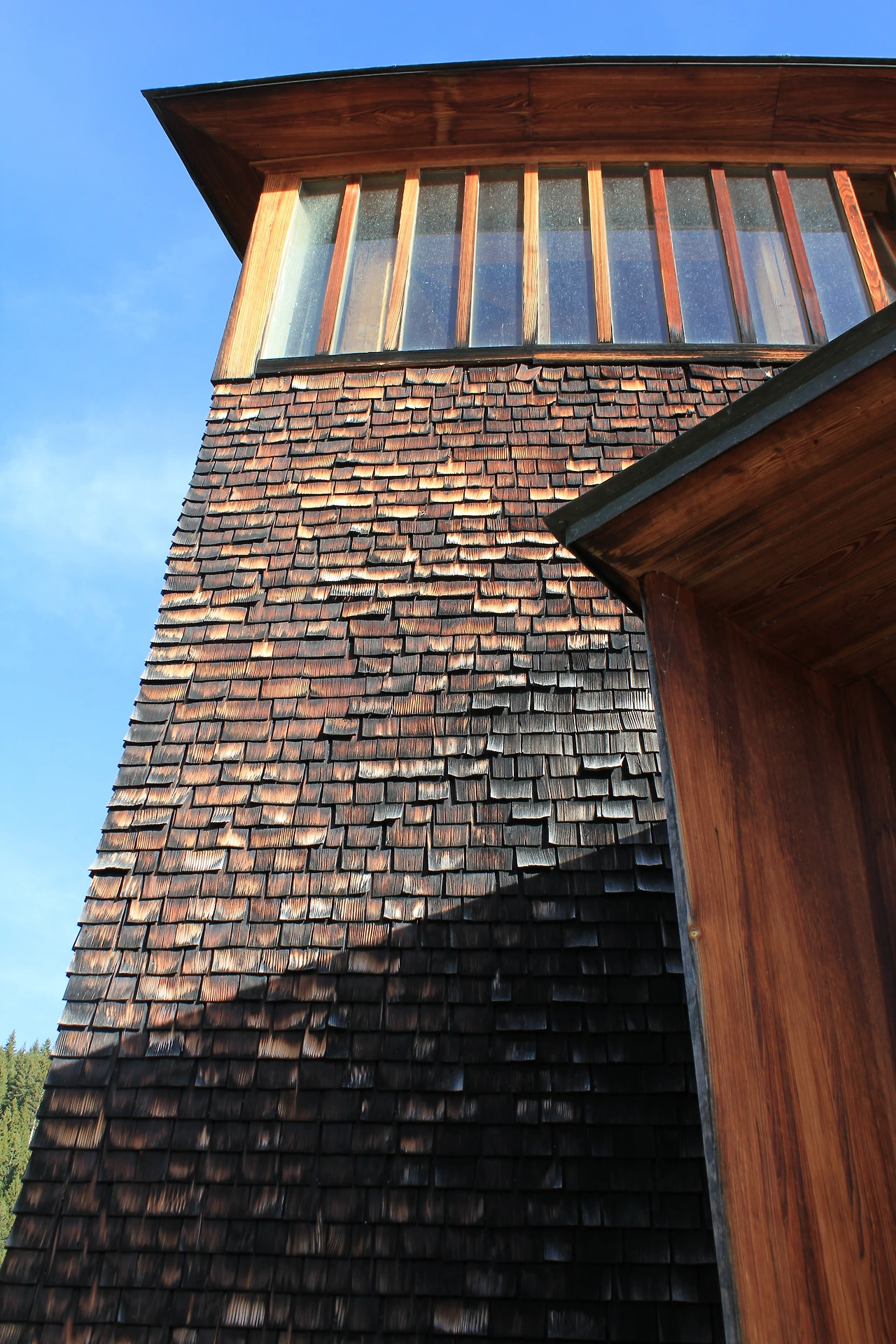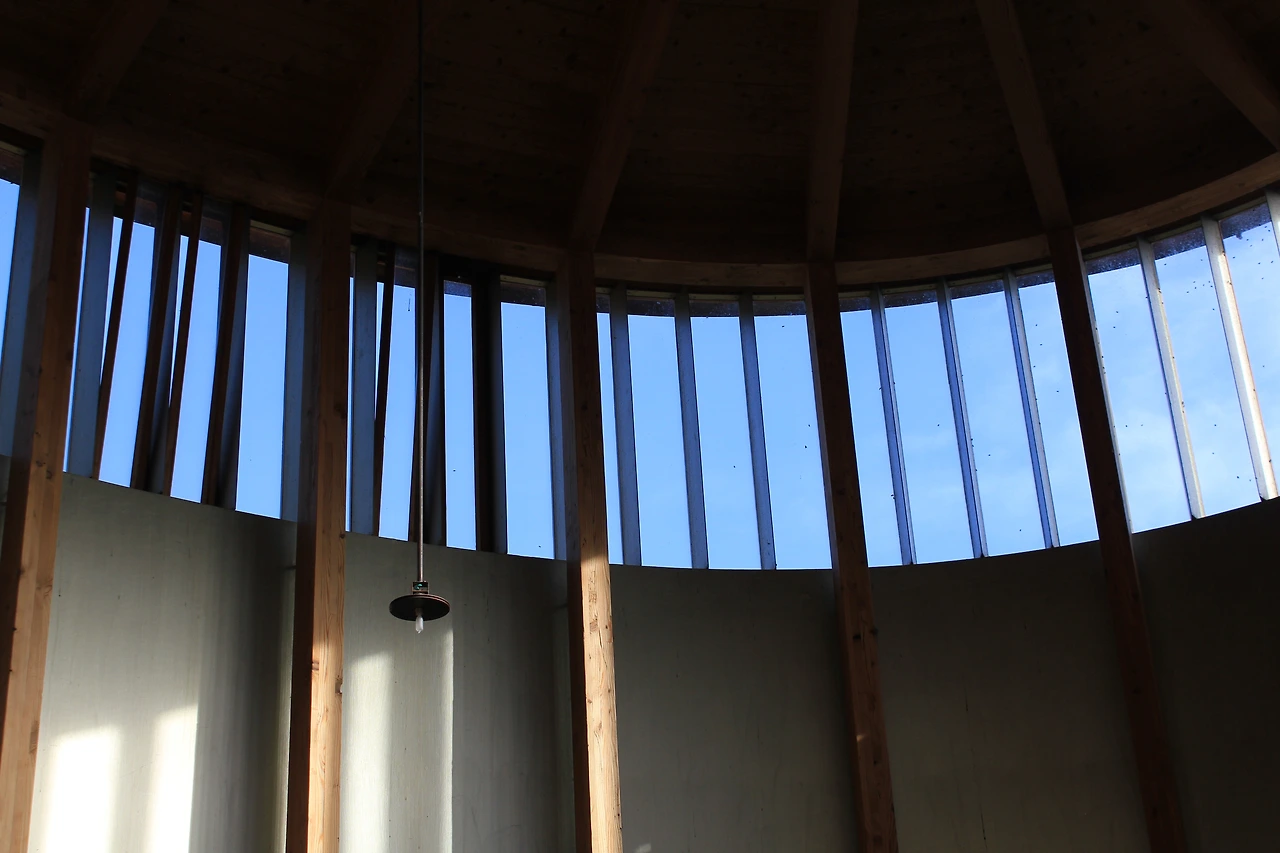 내부에 들어선 순간 정말 외부가 산이 아닌 바다라고 믿을 정도였다. 남측 고측창에서 들어오는 빛은 북측 벽에 가느다란 목재 프레임들을 피해 리듬감 있는 빛이 들어온다. 내부는 피터줌터의 손길을 직접 느낄 수 있다. 노출된 목재 구조들과 합판, 줌터의 촛불 조명부터 도어 손잡이까지