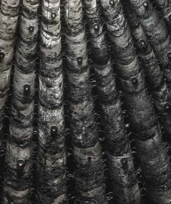 불에 타 없어진 거푸집들은 형채를 감출 뿐 콘크리트 벽에 그을린 자국과 냄새만을 풍기며 살아 숨 쉰다. 거푸집의 온기는 콘크리트로 옮겨져 그 존재를 확인할 수 있다. 이렇게 내부는 소나무 줄기를 나타내며 동굴과 같은 공간을 만들어 낸다.