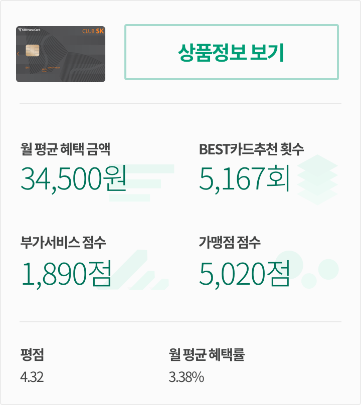 국내 1위 통신사와 주유소인 SKT, SK엔크린에서 특별 할인을 받을 수 있는 하나 클럽 SK카드가 2위를 차지했습니다. 이 카드는 조건에 따라 할인 금액과 한도가 달라져 혜택이 다소 복잡하니, 눈을 크게 뜨고 살펴 보셔야 할 것 같습니다.