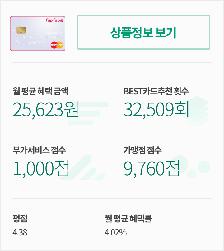 2위에 오른 삼성 Taptap O 카드는 나의 라이프 스타일에 맞게 쇼핑,커피 업종으로 구성된 6개의 옵션 패키지 중 하나를 선택하여, 할인 또는 적립을 받을 수 있는 카드입니다. 매달 옵션 변경이 가능해, 나의 소비 계획에 따라 혜택을 뽑아 먹을 수 있어요!