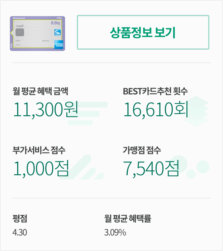 게다가 3대 이동 통신 업체, 4대 백화점, 전국 모든 편의점 등 평소 많은 분들이 이용하는 가맹점 위주로 할인을 제공해 비교적 높은 가맹점 점수를 얻었습니다.