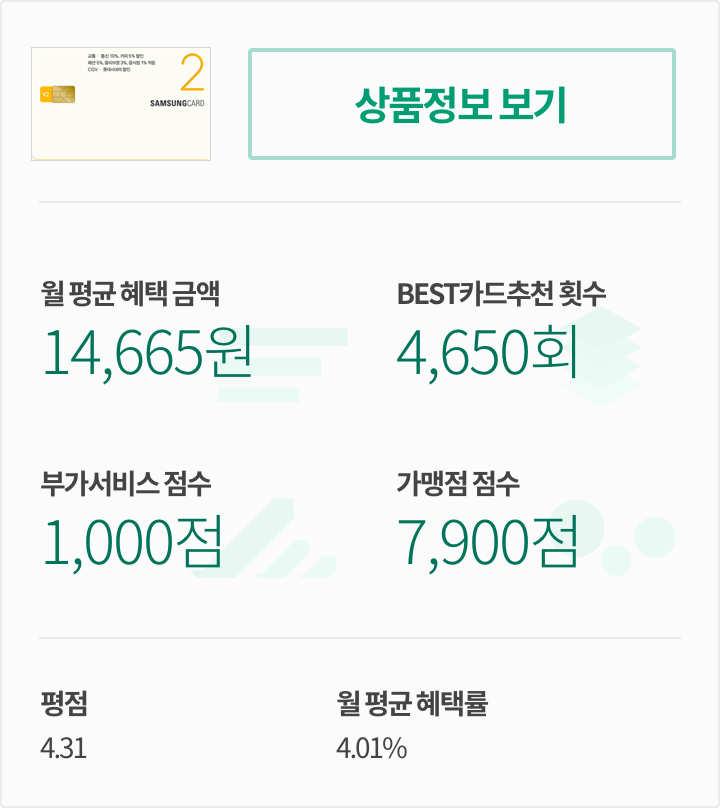 2위에 오른 삼성카드2 V2카드는 할인과 적립, 두 가지 혜택을 제공하는 카드입니다. 지난 달 카드 사용 금액이 30만원 이상이라면 대중교통/이동통신 10%, 커피 5%, 영화 최대 3,000원 할인을 받을 수 있어요. 매달 통신비 5만원, 영화 1만원, 스타벅스 3만원 정도를 소비하신다면 달마다 9천원 정도가 할인됩니다.