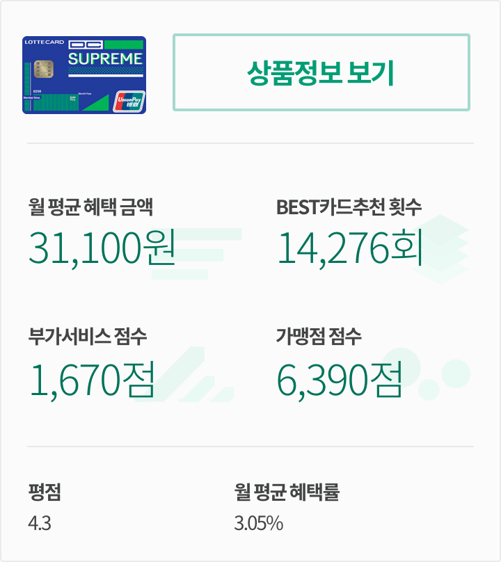 3위를 차지한 카드는 롯데 디씨 슈프림카드입니다. 이 카드는 백화점/마트 업종의 그룹 1, 학원/서점, 병원/약국, 대중교통, 뷰티, 요식 총 5개의 업종으로 이루어진 그룹 2에서 각각 7% 할인을 제공하는데요. 2개의 슈프림 그룹에서 각각 2만원씩 총 4만원까지 할인 혜택이 제공됩니다. 달마다 마트 20만원, 대중교통 10만원, 스타벅스 3만원, 베이커리 2만원, 백화점 5만원 정도를 사용하신다면 매달 2만 5천원정도를 아낄 수 있겠네요.