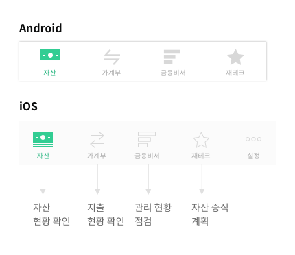 4개의 탭은 각자 역할과 기능이 다릅니다. 하지만 모두 고객의 정확한 자산관리를 위해 존재합니다. 따라서 서로 유기적인 맥락을 제공해 고객이 자산관리의 A to Z를 완벽히 누릴 수 있게 만드는 것, 그것이 제품팀과 서비스의 목표입니다.
