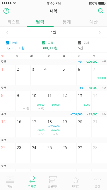 지출 관리자는 매일, 매주 지출 현황을 파악하지만 결국 '이번 달' 지출이 얼마나 순항하고 있는가를 파악하기 위한 루틴입니다. 따라서 이번 달 돈이 들어가고 나가는 흐름을 한눈에 확인할 수 있는 달력 뷰 역시 필수 기능입니다.
