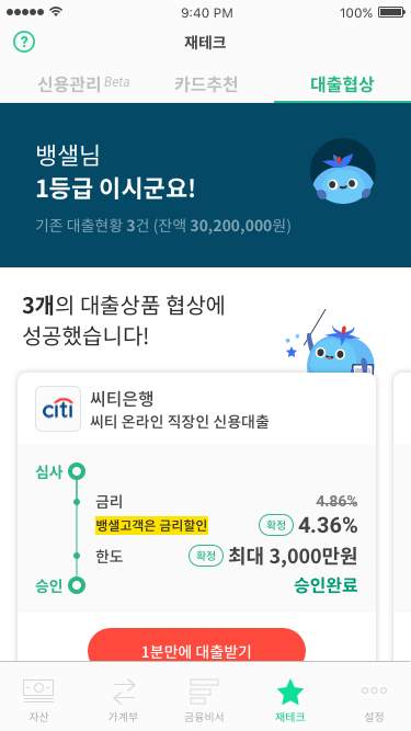카드 추천과 달리 대출은 왜 '대출 협상'일까? 아마 협상이라는 단어를 처음 보았을 때 다소 생소하다는 느낌을 받으셨을지도 모르겠습니다. 대출 협상이라는 이름을 선택한 이유는 시장에 없던 새로운 서비스라는 인상을 더욱 명확하게 하기 위해서였습니다.
