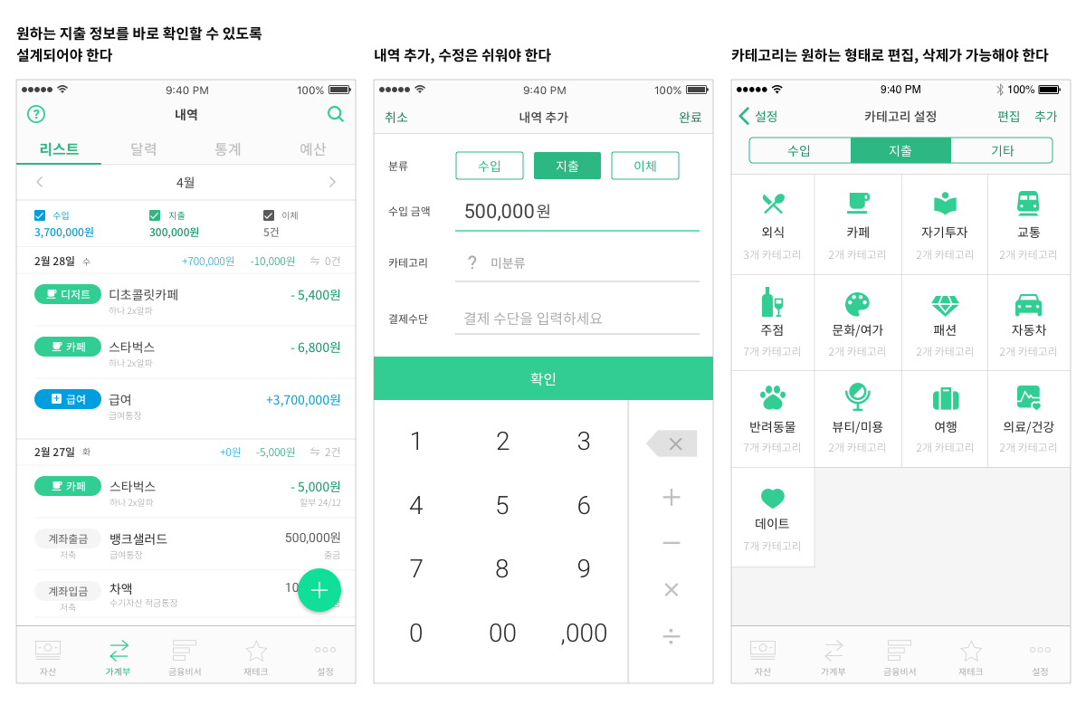 즉, 자신의 지출 습관을 '있는 그대로, 빠짐없이' 작성할 수 있으며, 이 기록을 '직관적으로, 한눈에' 확인할 수 있어야 합니다.