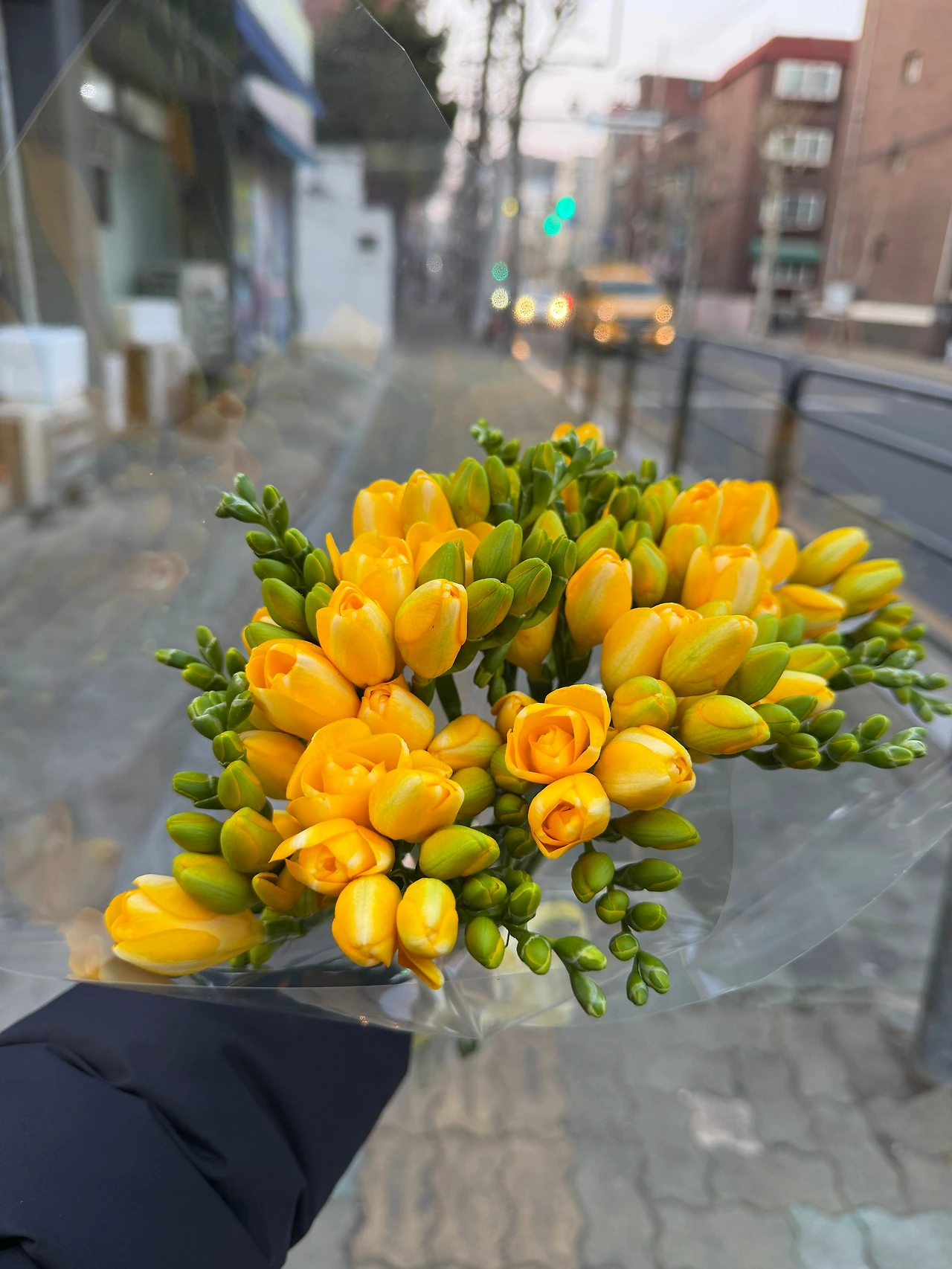 꽃집에서 색이 예쁜 프리지아를 포장해