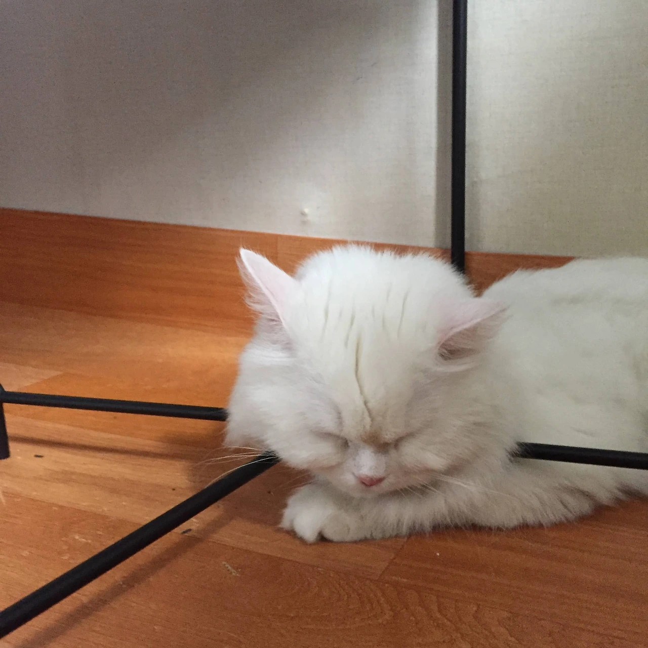 이 더운 계절이 힘든 것은 나뿐만이 아니다. ‘이제 여름이네’ 하면 구름이는 세탁기 안으로 숨어든다. 때문에 한 계절 동안은 빨래를 하려면 읍소를 해야 한다. “저기 고양이님, 저희가 빨래를 해야 하는데요. 나와 주시면 안 될까요…?” 만약 세탁기 문이 닫혀있기라도 하면 문을 열라고 화장실 이용하러 온 (인간)집사에게 민원을 제기한다. 통돌이 세탁기 안이 스테인리스로 되어 시원하다는 것은 어떻게 아는 것인지 정말 신통방통하다. 그뿐만이 아니라 더위를 식히기 위해 차가운 재질에 온몸을 최대한 밀착한다. 빨래건조대라던가 의자의 스틸 부분이라든가. 옥상에 올라가서도 에어컨 실외기 거치대에 끼어 있듯 누워 있다. 그럴 거면 그냥 집에 편히 누워있지 왜 굳이 짜부되려 올라가는 것인지 이해할 수 없지만, 여름을 나는 방법이니 그냥 이해하려 한다. 근데 너 그거 아니? 가뜩이나 더운데 몸을 움직여야 하는 수고로움과 옥상에 오르자마자 몸에 달라붙는 태양의 따가움이 얼마나 불쾌한지.