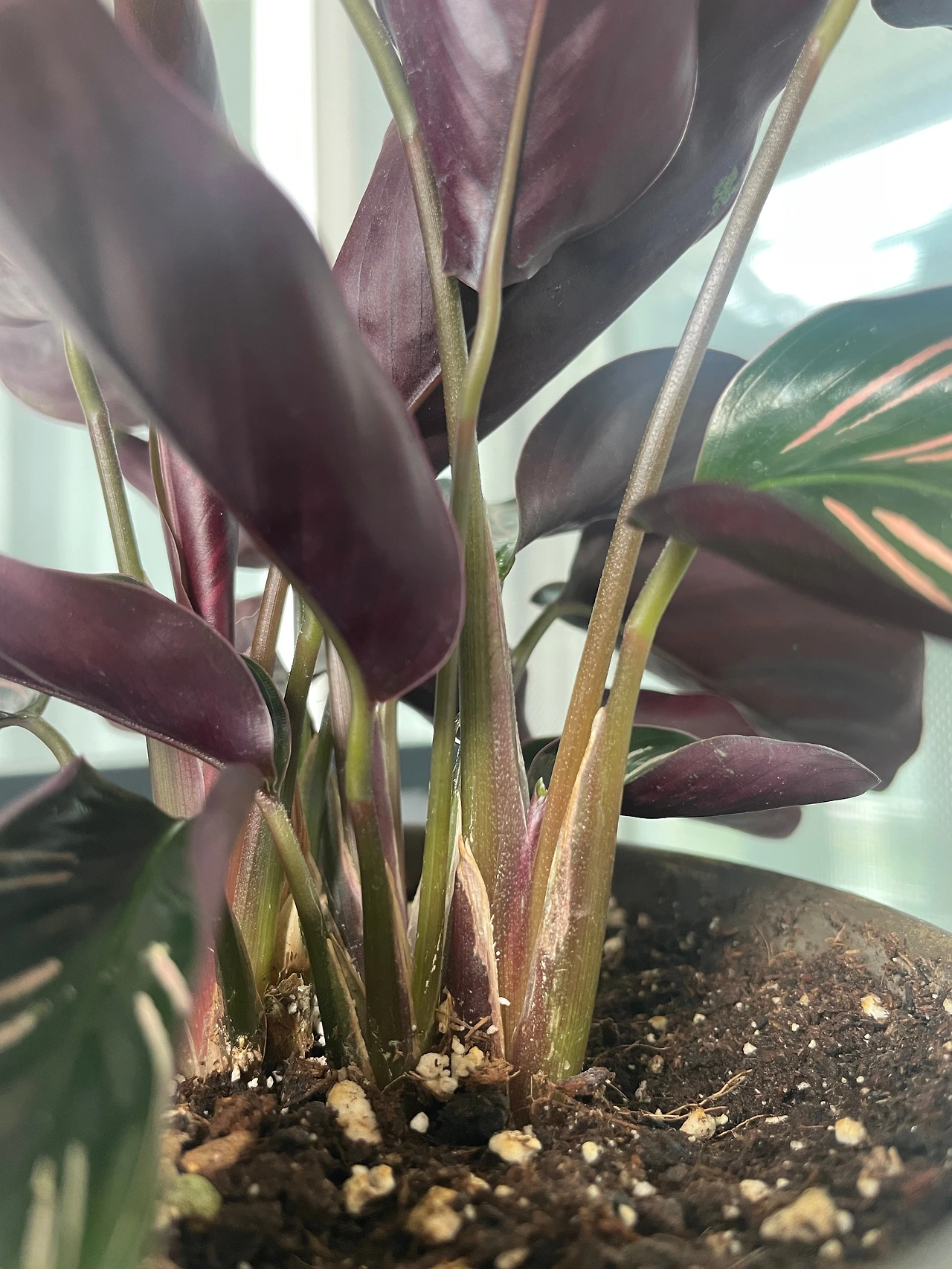 그리고 잎에 묻은 하얀 물 자국은 수돗물에 녹아있던 칼슘 성분이 물의 증발로 인해 하얗게 남아 굳어버린 것이라고 했다. 해결 방법은 역시 또 구연산이었는데, 구연산 성분이 들어있는 박카스나 탄산이 있는 맥주를 행주나 키친타월에 묻혀 살살 잎을 닦아 주면 해결된다고 한다. 맥주보다는 박카스를 추천하는 바고, 잎을 닦아주고 난 뒤에는 깨끗한 물로 한 번 더 닦아주고 물기를 제거해주면 반짝반짝 광이 나는 잎들을 다시 볼 수 있다고 한다. 잎이 깨끗해야 식물이 광합성을 더 많이 할 수 있다길래, 이 또한 지금 상태보다 흰 얼룩이 더 심각해졌을 때 살살 지워주기로 했다. 이런 물 자국이 왜 생겼나 곰곰이 생각해보니 수돗물을 받자마자 바로 물 주기에 사용했던 것 같다. 칼라데아 종류들은 수돗물의 염소 성분에 특히 예민해서, 수돗물을 받아 하루 이틀 지난 실온의 미지근한 물을 주어야 별 탈 없이 건강하게 자랄 수 있다고 한다.