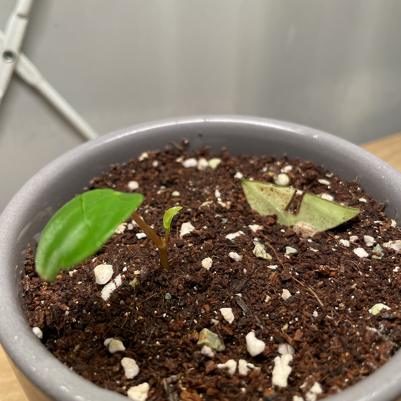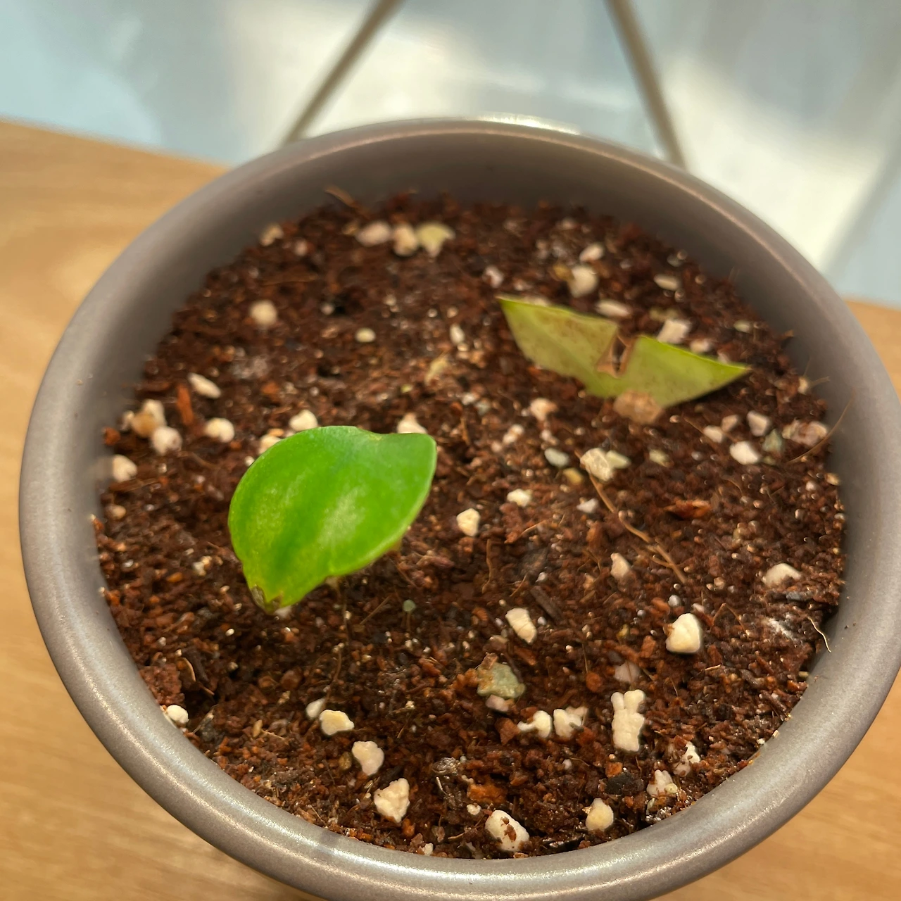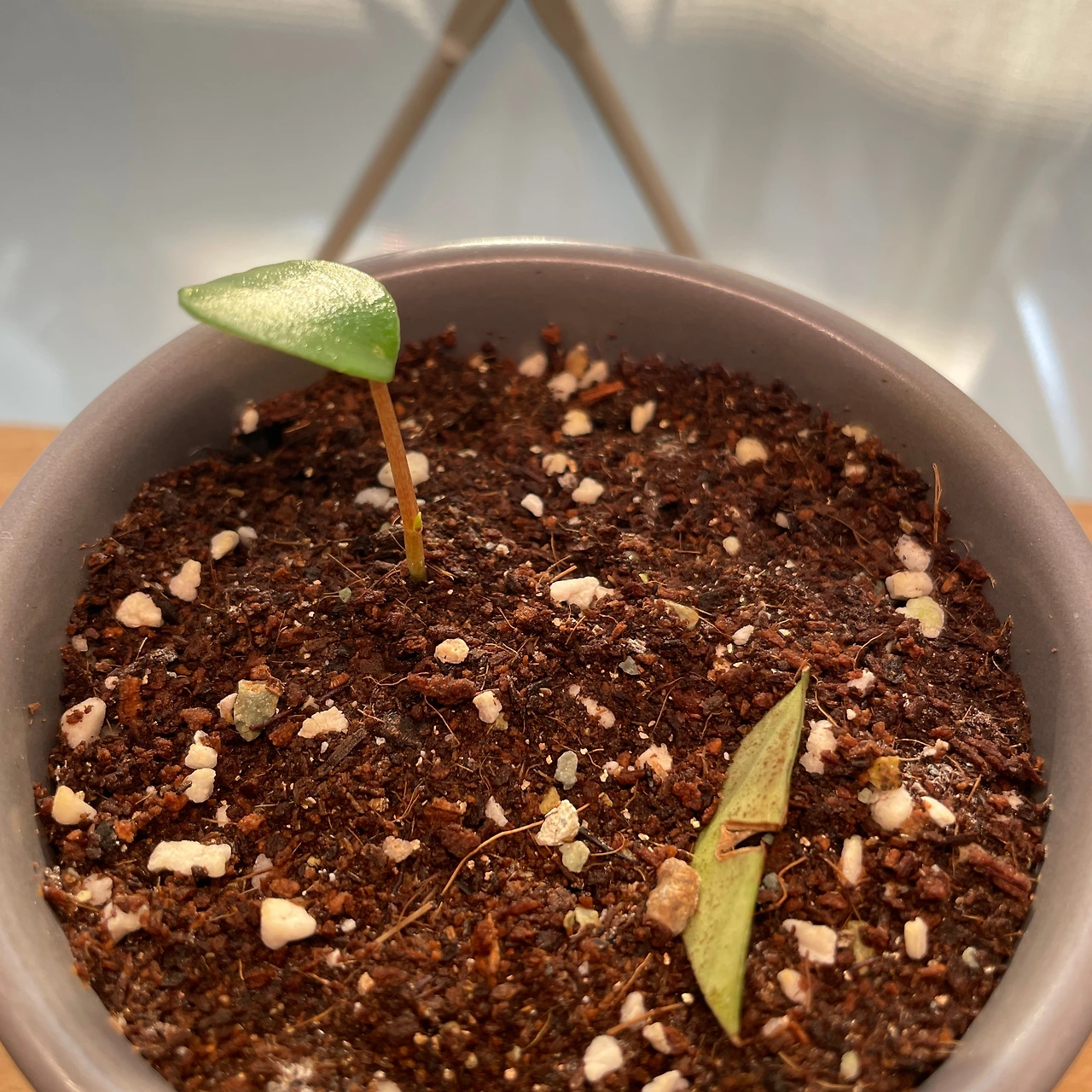 마치 우주선이 고장 나서 지구에 불시착한 외계인 같았다. 사진처럼 저렇게 두 개로 분리된 개체가 아니라, 사실 잎꽂이해두었던 잎에 붙어 생겨난 새싹이었고 저 둘은 원래 하나였다. 그런데 분갈이하는 도중에 친구를 돕겠다고 나섰던 나의 실수로 인해 잎에 붙은 새싹이 그만 뚝 하고 분리되고 말았다. 즉, 친구가 수태에서 애지중지 잎꽂이해서 겨우 키워낸 꼬꼬마 새싹을 내가 실수로 망가트려 버린 것이었다.