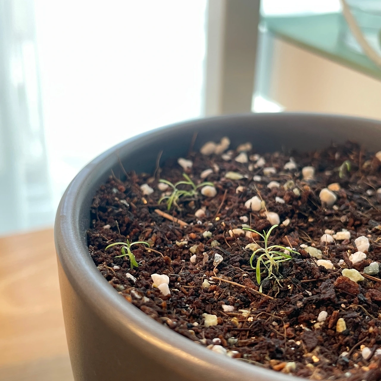 마지막 분갈이를 했던 11월 초부터 영상 기온을 맴돌던 11월 말까지, 안개꽃을 우리 집 발코니에 두었는데 역시 그곳은 우리 집 명당이었다. 그늘진 친구의 사무실에서는 몇 달째 변함없는 작은 새싹 신세였는데, 우리 집 명당에 있는 동안 옆자리 페페와 함께 쑥쑥 잘 커 주며 성장세를 보여주었다.