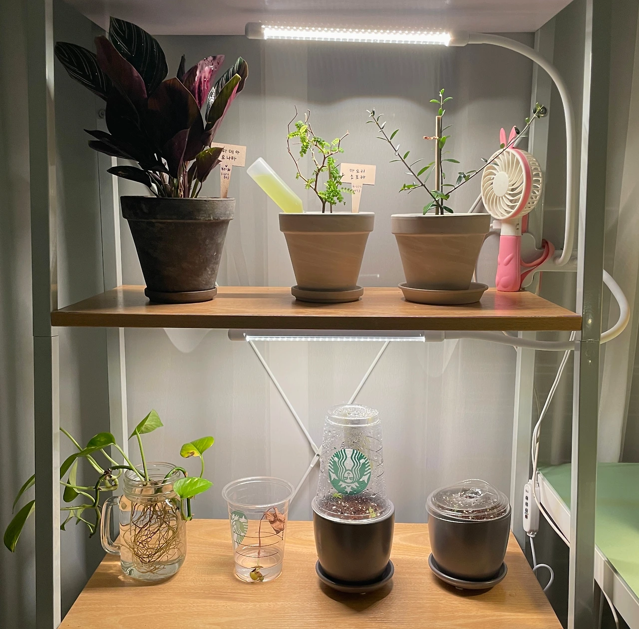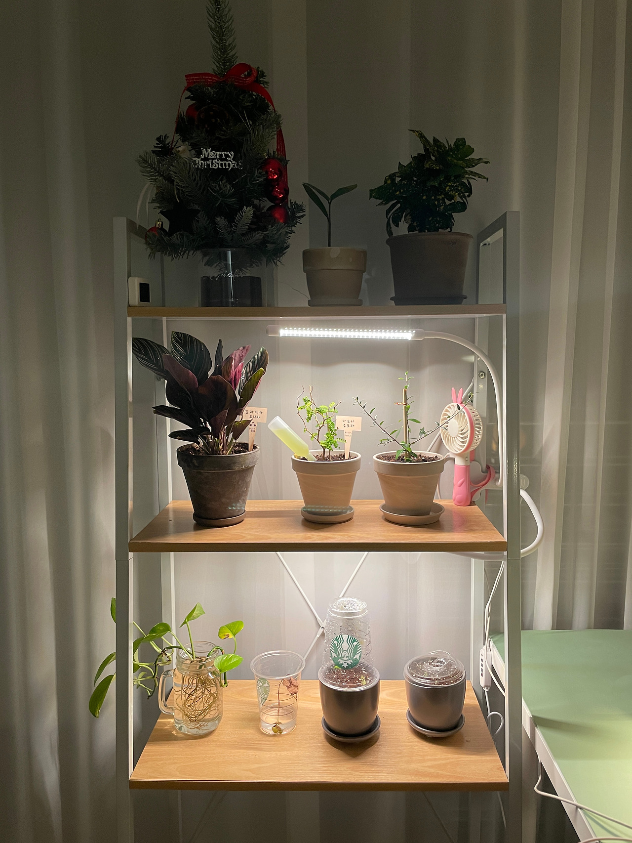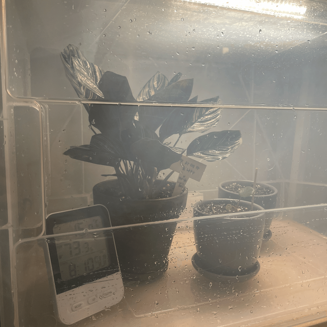 결과는 성공적! 어떻게 선반 칸 높이랑 리빙 박스랑 딱 맞지? 뚜껑을 열었다 닫았다가 하기 편하게 선반에 리빙 박스를 가로로 눕혀주었다. 미닫이문처럼 여닫을 수 있었고 안에 넣어 둔 온습도계로 확인해보니 내부 습도도 잘 유지되었다. 그리고 그 위로 식물 등 하나를 배치해주니 여타 온실장들 저리 가라 할 정도로 꽤 괜찮아 보였다.