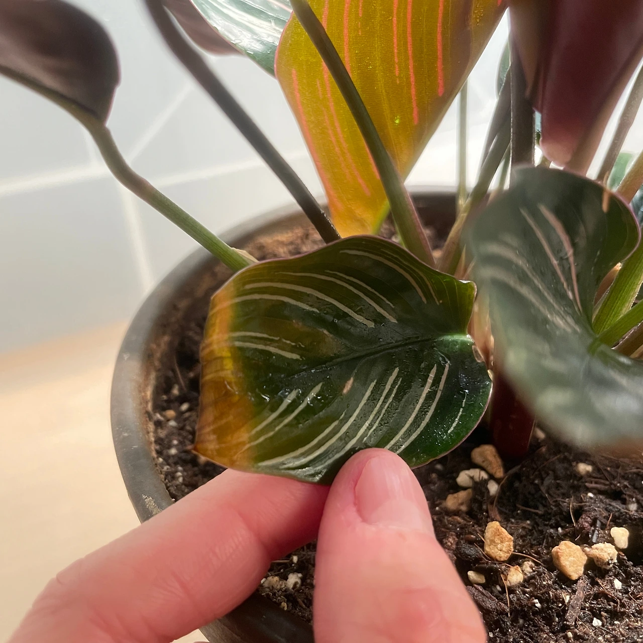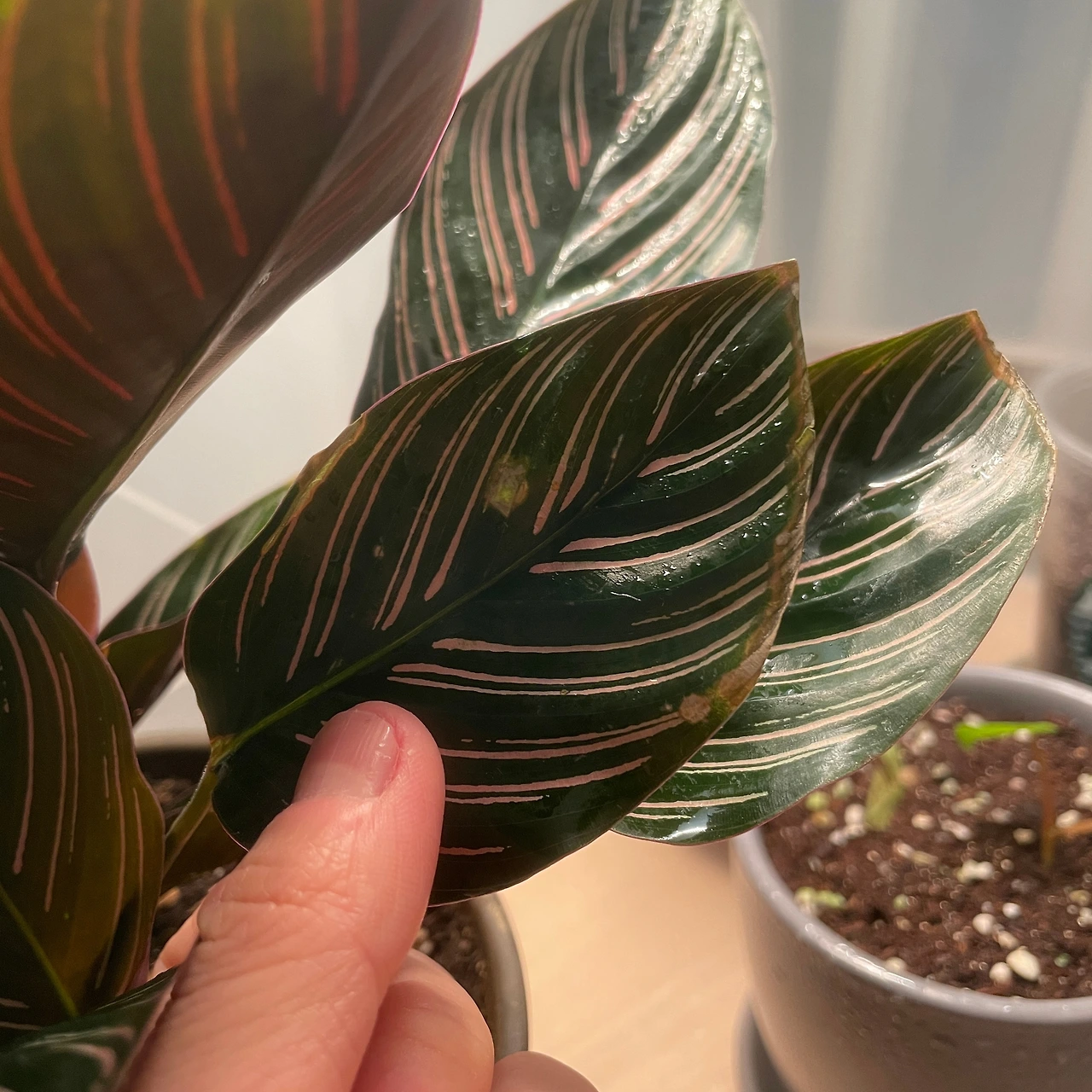 사용한 지 약 15일 차, 확실히 칼라데아 오나 타의 말린 잎이 펴졌고 잎끝이 덜 탔다. 꼬박꼬박 환기도 해주고 분무도 자주 해주니 리빙 박스 안이 습해져서 녀석의 불만이 해소된 듯싶었다. 이미 어느 정도 타들어 가던 잎이라 그런지 그중 한두 개 잎은 그래도 계속해서 타들어 가길래 아예 잘라주기로 마음먹었다. 온실을 만들어주고 나서는 녀석 또한 다른 애들과 마찬가지로 꾸준히 잘 커 주고 있고, 지금도 화분 가득 빽빽한 느낌인데 아랑곳없이 흙에서 새로운 줄기가 쭉쭉 뻗어 나왔다.