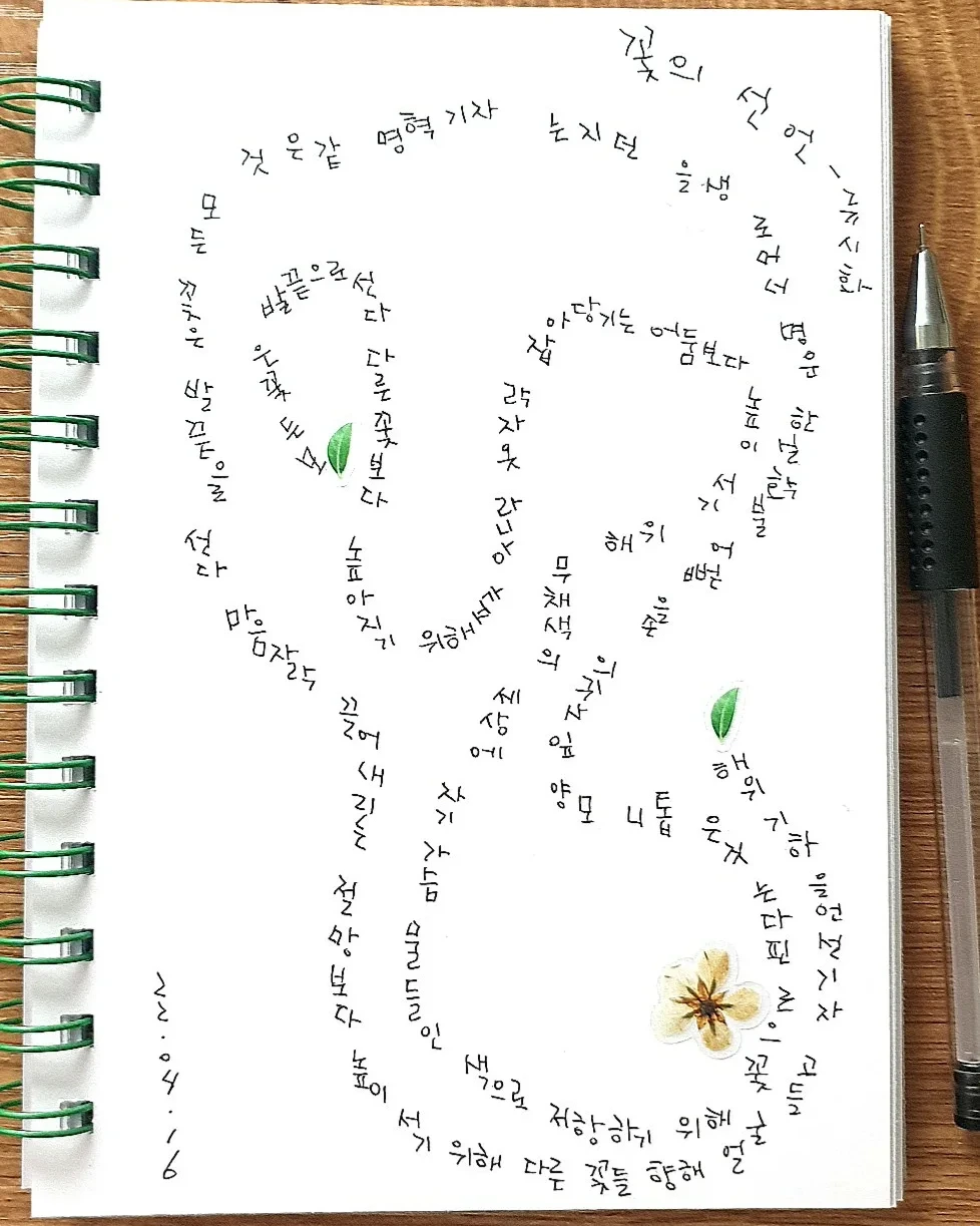 아침에 일어나 짧게 따라 쓴 시 필사 앞에서 줄 맞춰 쓰고 싶지 않은 날이다. 그렇다고 어떤 의도가 있지도 않다. 그냥 펜이 가는 데로 따라가며 적는다. 흐름에 맡긴 필사는 정해진 틀을 벗어난 나를 멋져 보이게 한다.