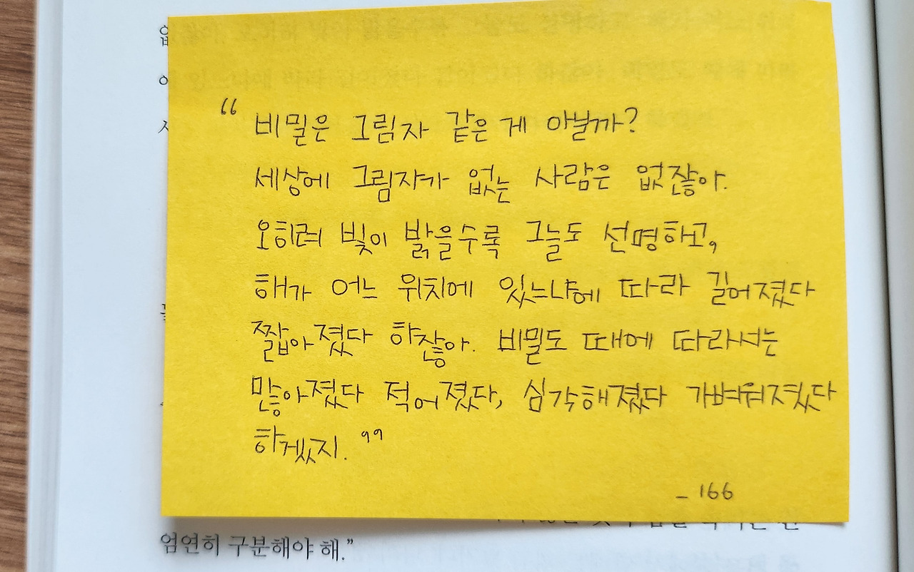 비밀은 그림자 같은 게 아닐까? 세상에 그림자가 없는 사람은 없잖아. 오히려 빛이 밝을수록 그늘도 선명하고, 해가 어느 위치에 있느냐에 따라 길어졌다 짧아졌다 하잖아. 비밀도 때에 따라서는 많아졌다 적어졌다. 심각해졌다 가벼워졌다 하겠지. _166