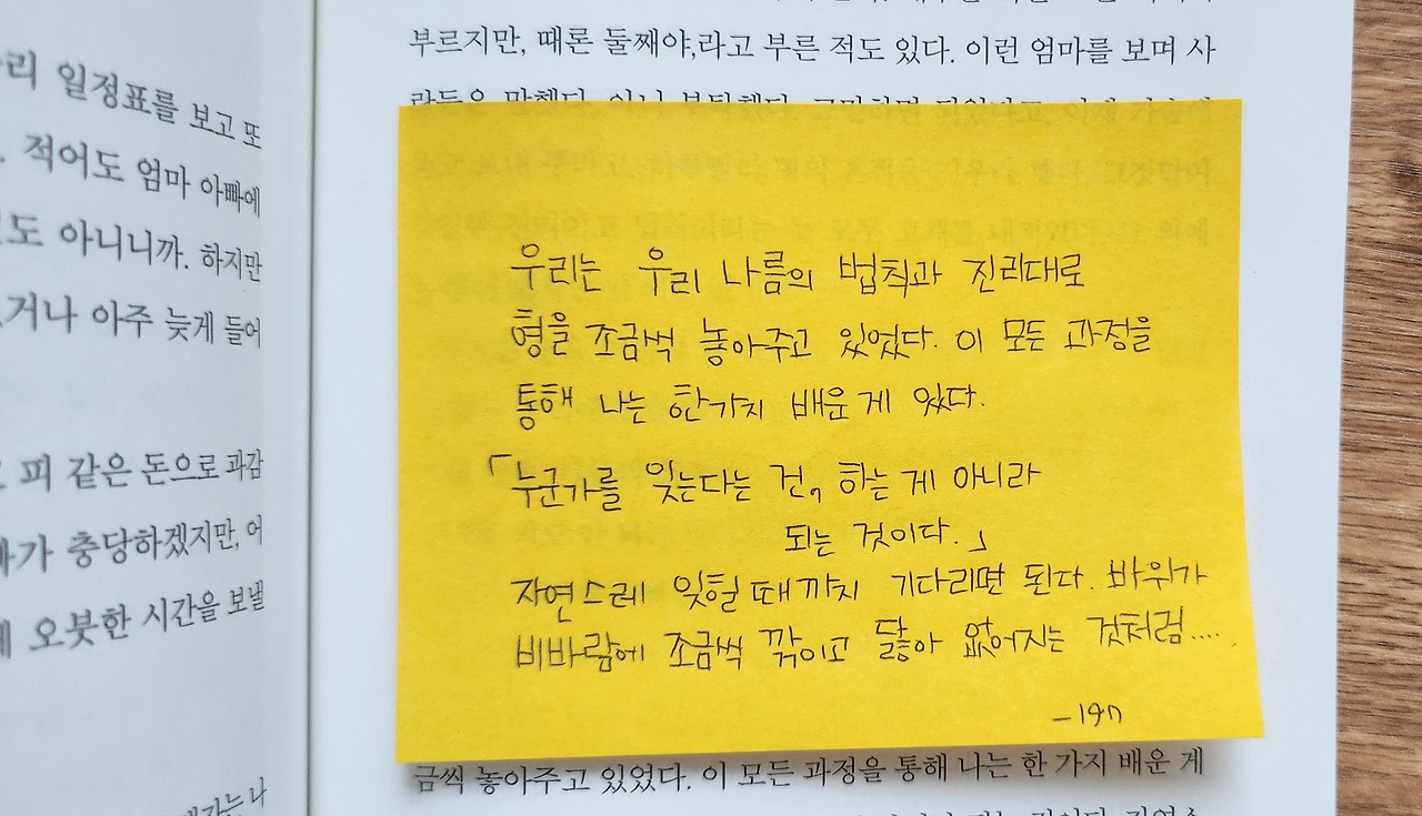 우리는 우리 나름의 법칙과 진리대로 형을 조금씩 놓아주고 있었다. 이 모든 과정을 통해 나는 한 가지 배운 게 있다. 누군가를 잊는다는 건, 하는 게 아니라 되는 것이다. 자연스레 잊힐 때까지 기다리면 된다. 바위가 비바람에 조금씩 깎이고 닳아 없어지는 것처럼.... _197