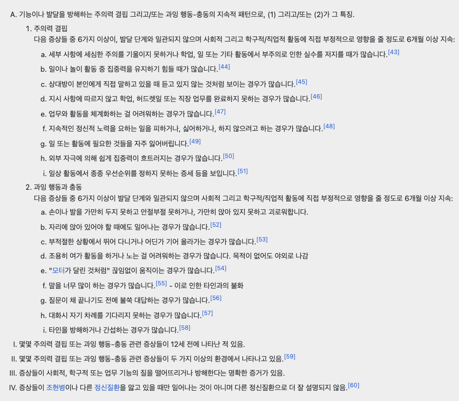 아래 ADHD 진단 기준을 옮겨와 봤다.