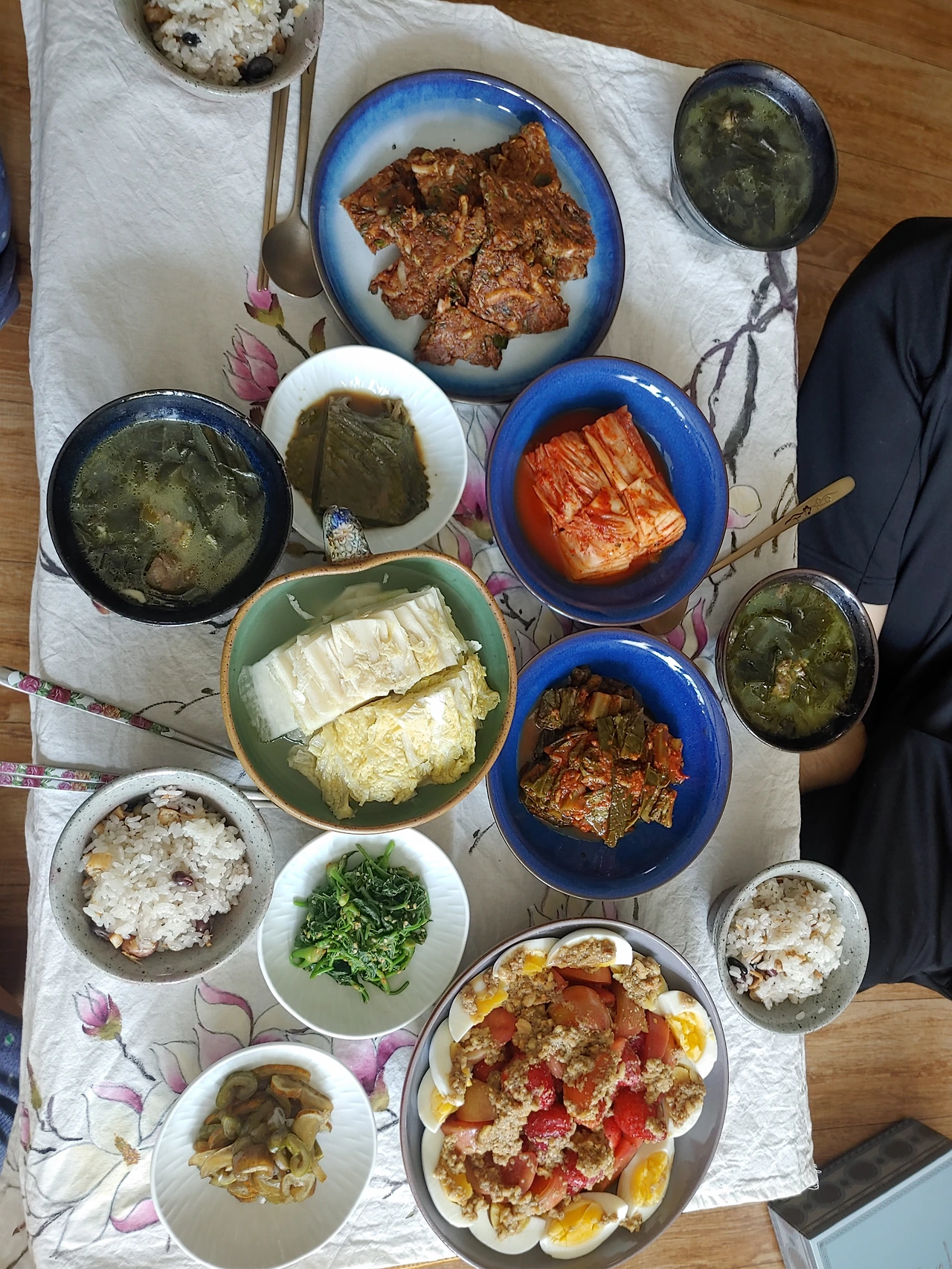 이렇게 간단한 아침상을 보는 데도 7시 10분부터 9시 30분까지 했다. 김치 냉장고에서 김치며 장아찌 내놓는 것도 일이고, 안 깔던 상보 내서 까는 것도 일이고, 안 쓰던 수저받침 꺼내서 세팅하는 것도 일이다. 조금은 이쁜 그릇으로 세팅하기 위해 평소에는 거들떠보지도 않던 그릇그릇 꺼내 담는 것도 일이고, 물 잔 받침대에 쟁반 받쳐내는 것도 일이다.