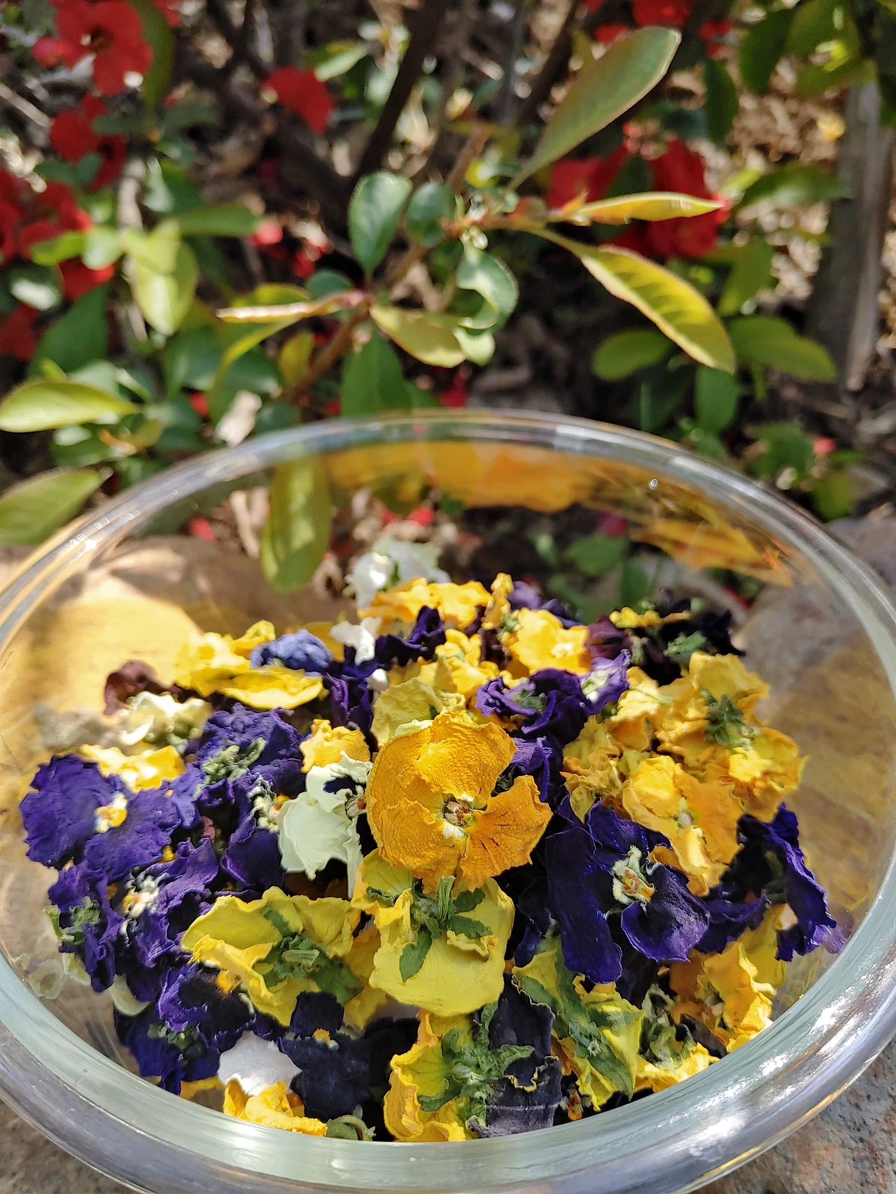 팬지꽃차. 맛보다는 물색에 반해 가꾸고 따고 덖는다. 꽃차를 덖고 땅콩을 볶아내고 커피를 내려 목을 축이고 …. 뒷집 소가 목울대를 울려 울멍울멍 소리를 내면 때가 된 듯하여 밥을 해 먹는다.